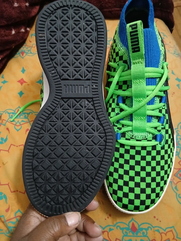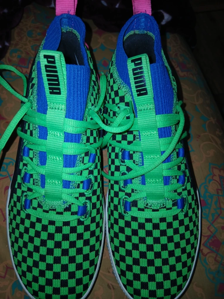 These Puma sneakers feature a vibrant green and black checkerboard pattern. They have blue and pink accents, and the Puma logo is visible on the side and back. They're in good condition and ready for a new home!