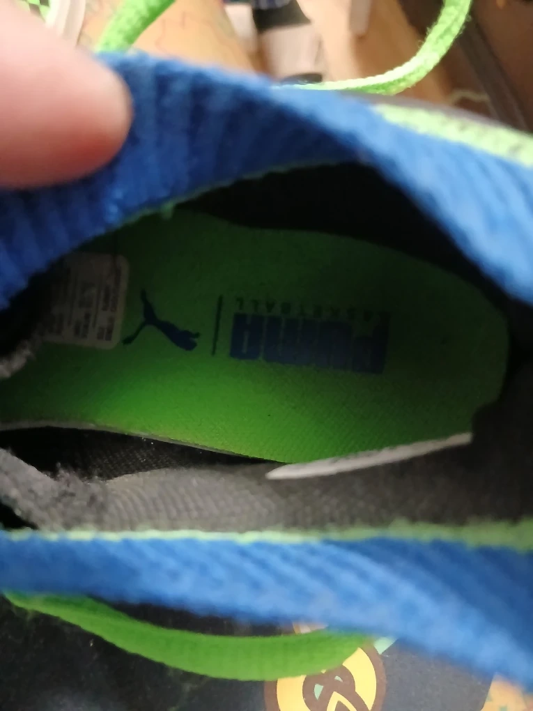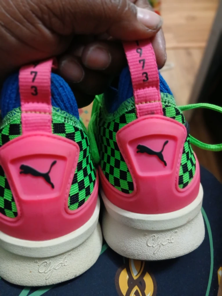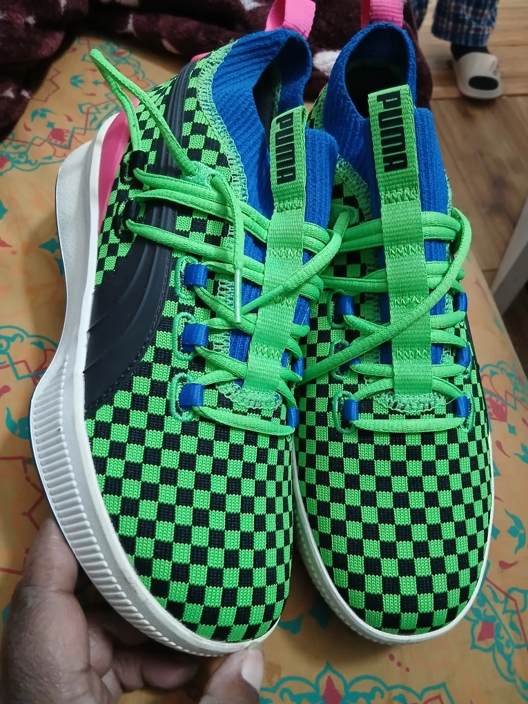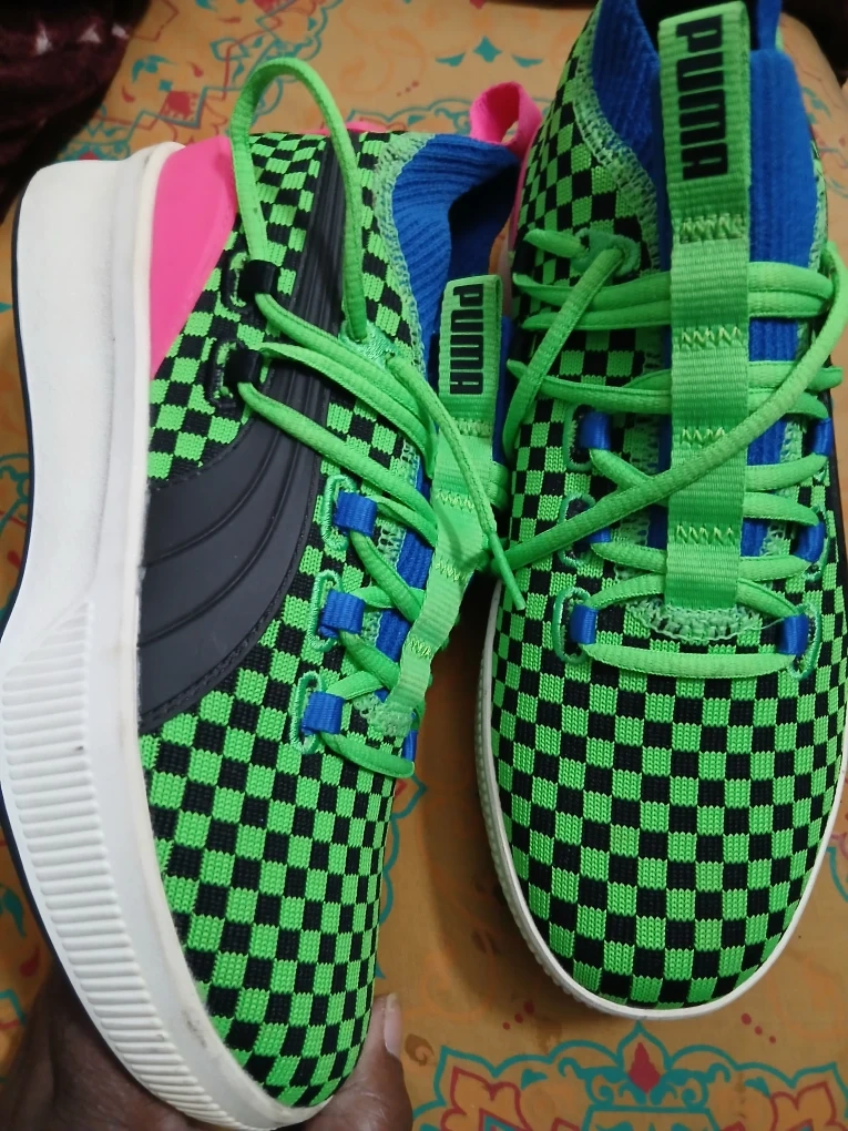 These Puma sneakers feature a vibrant green and black checkerboard pattern. They have blue and pink accents, and the Puma logo is visible on the side and back. They're in good condition and ready for a new home!