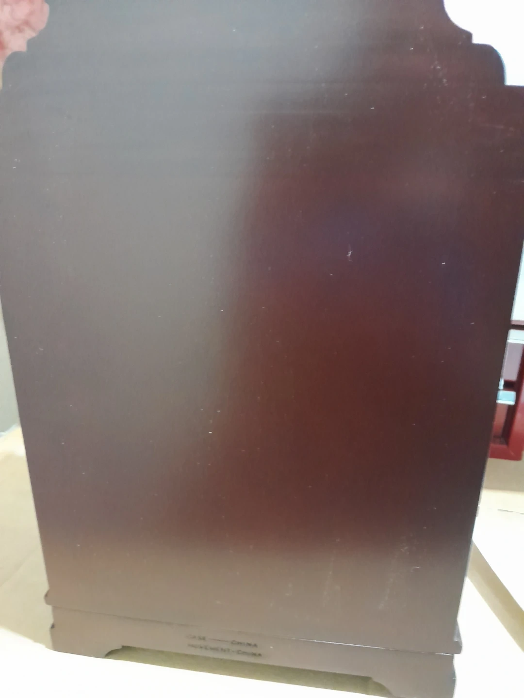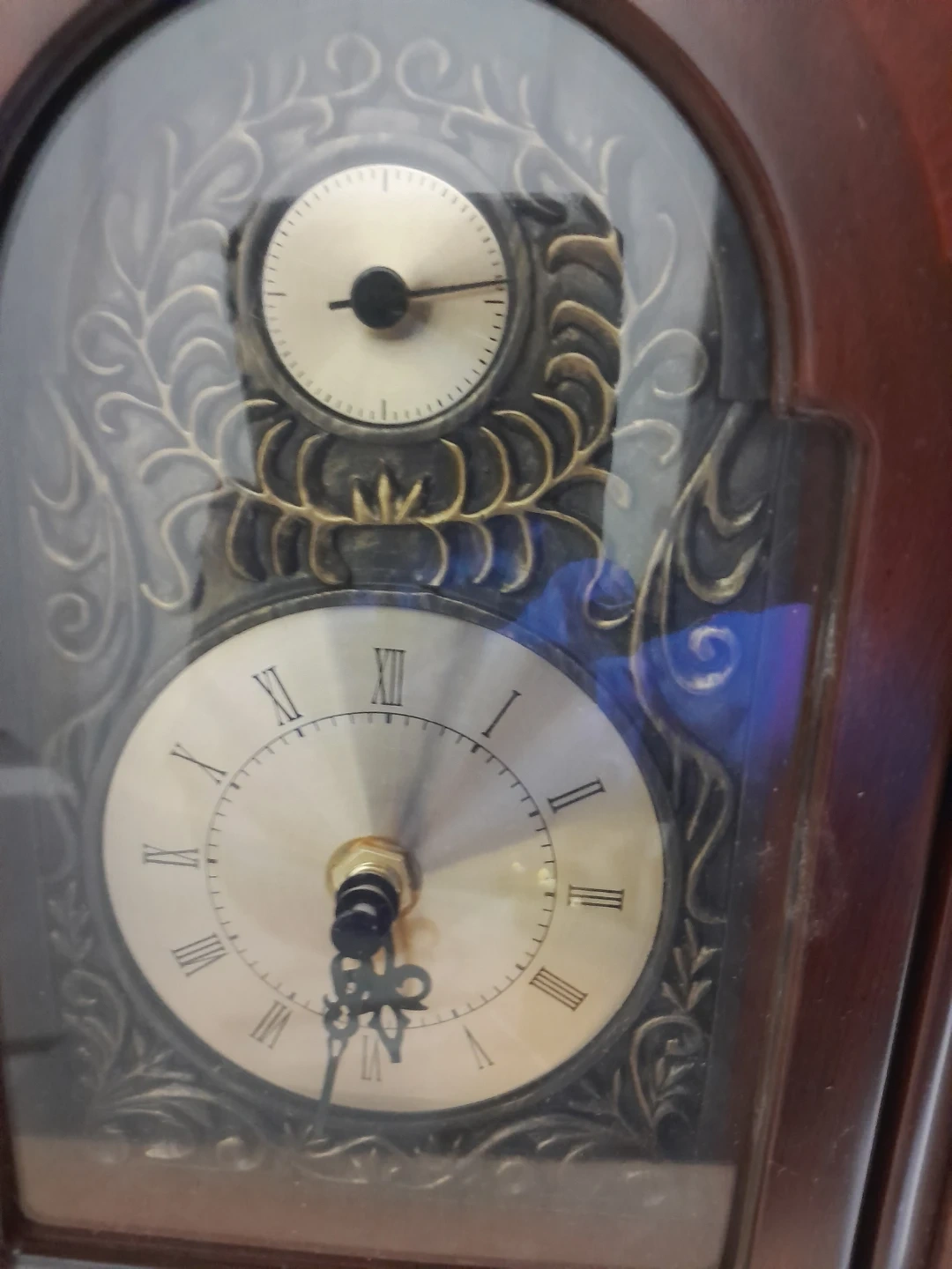 This is a Bombay Covington table clock. It features a rich wood finish and a decorative dial with Roman numerals. Battery is not included.