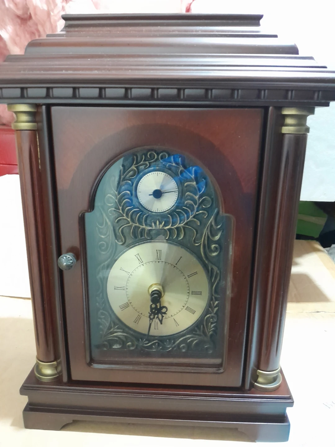 This is a Bombay Covington table clock. It features a rich wood finish and a decorative dial with Roman numerals. Battery is not included.