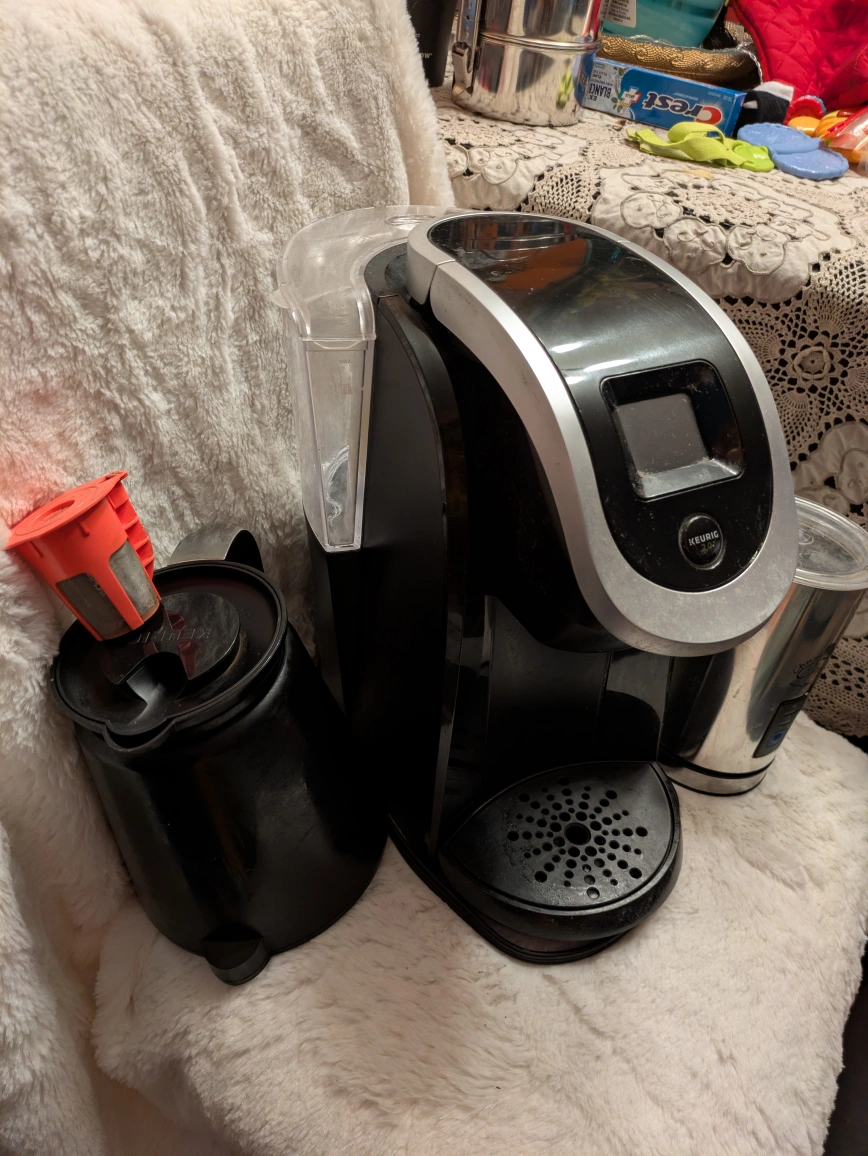 Selling a Keurig 2.0 coffee maker. It comes with a milk frother so you can make lattes and cappuccinos at home! Great for a quick cup in the morning or when you have guests over make a pot with the carafe. Easy to use and clean