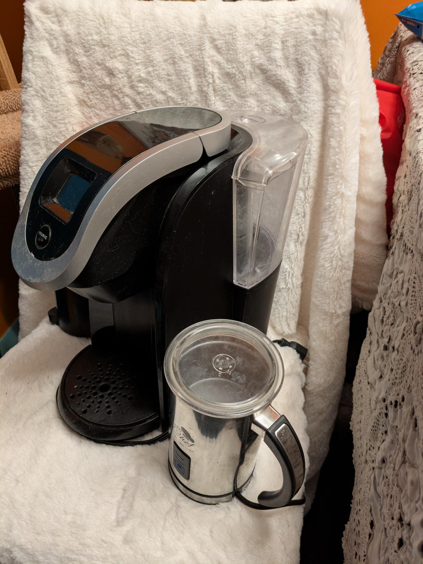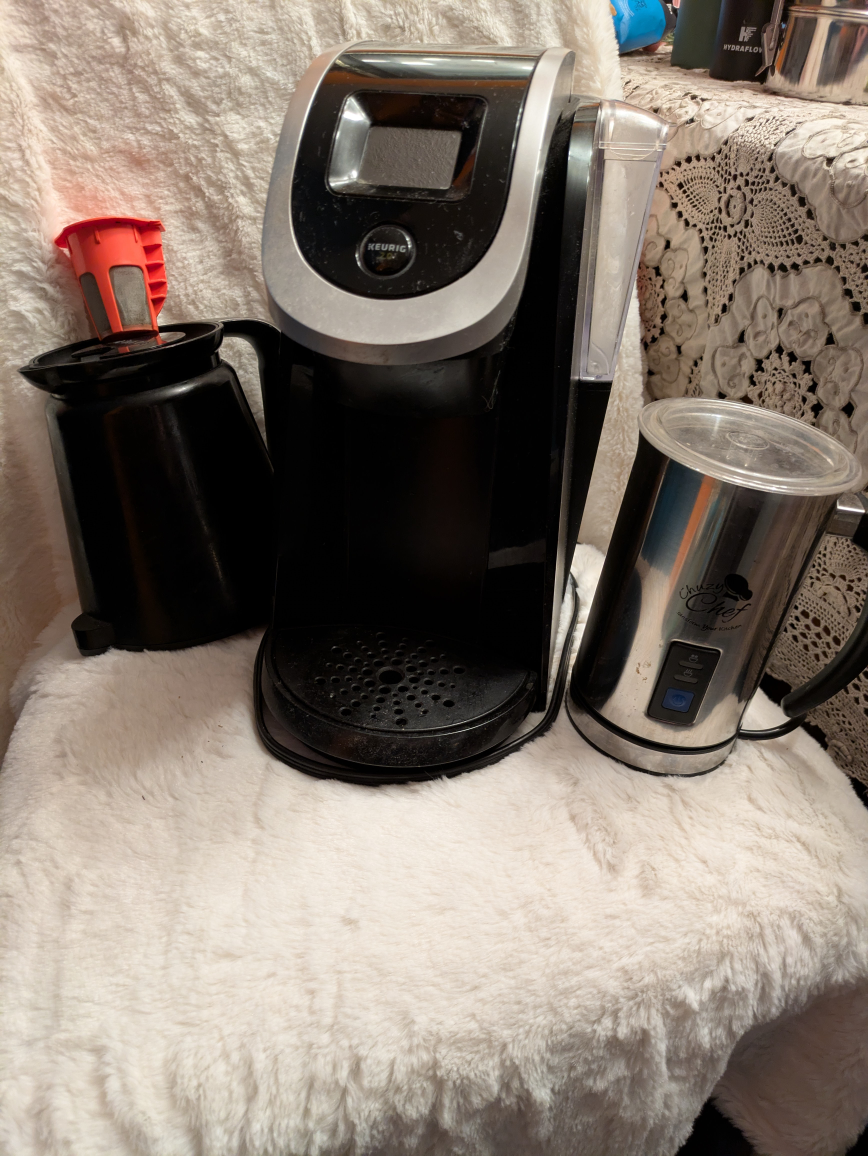 Selling a Keurig 2.0 coffee maker. It comes with a milk frother so you can make lattes and cappuccinos at home! Great for a quick cup in the morning or when you have guests over make a pot with the carafe. Easy to use and clean