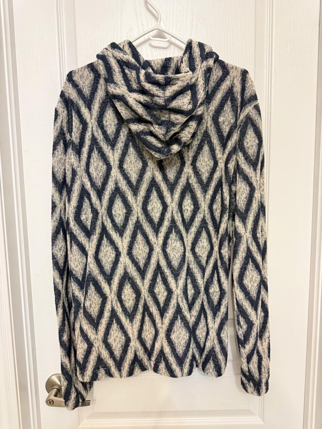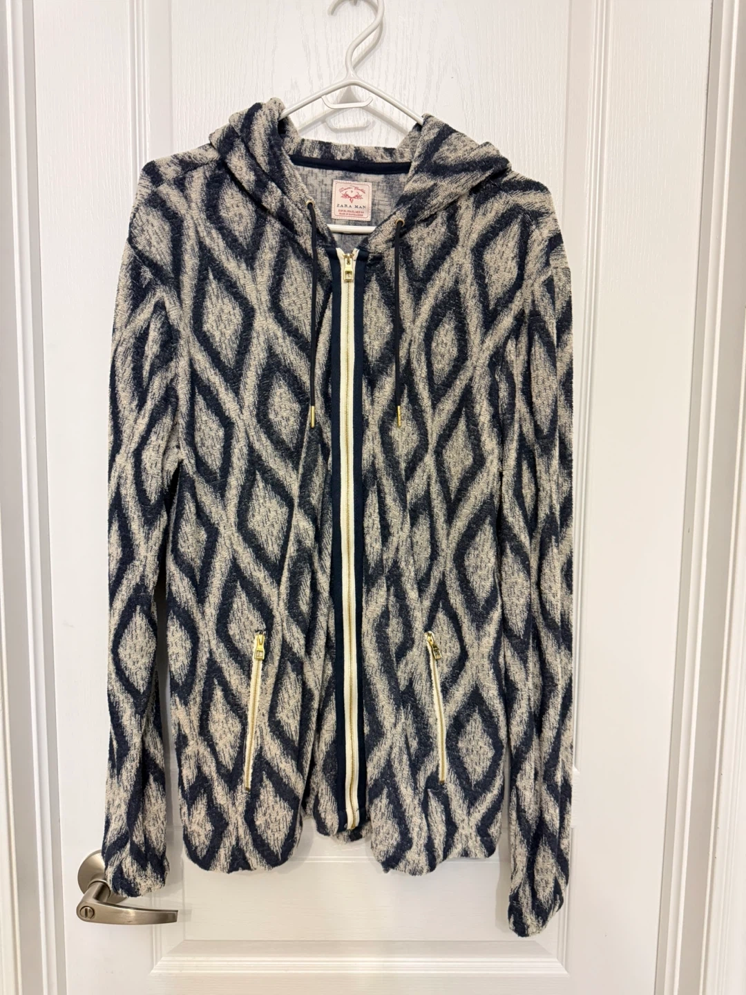 Zara Man Denim Culture Hoodie in size XL. It features a unique diamond pattern and a full zipper. Perfect for layering or wearing on its own!