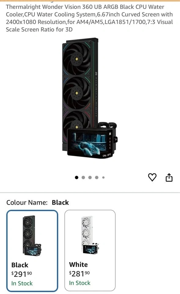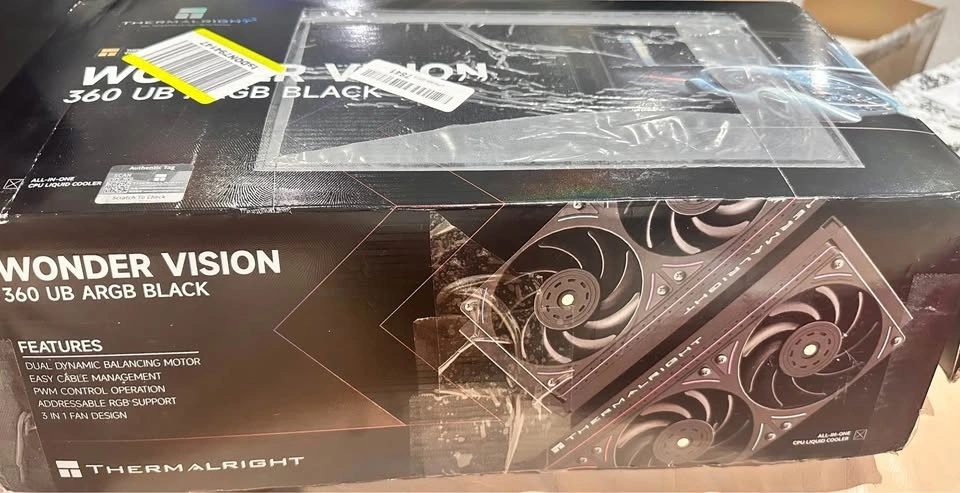 Selling a Thermalright Wonder Vision 360 UB ARGB Black CPU Water Cooler. This is a water cooling system featuring a 6.67-inch curved screen with 2400x1080 resolution. It's compatible with AM4/AM5 and LGA1851/1700 sockets. The cooler has a noise level of 27 Decibels and is made of metal and plastic. The fans are ARGB and have S-FDB V2 bearings for reduced friction and noise. The curved screen is detachable and powered by a 9-pin USB interface. TRCC software is required for screen control and can be downloaded from the official website. Installation is supported for Intel LGA 1150/1151/1155/1156/1200/1700/2011/2066 and AMD AM4/AM5. Please note that AMD installation requires the original motherboard backplane, which is not included. Let me know if you're interested!