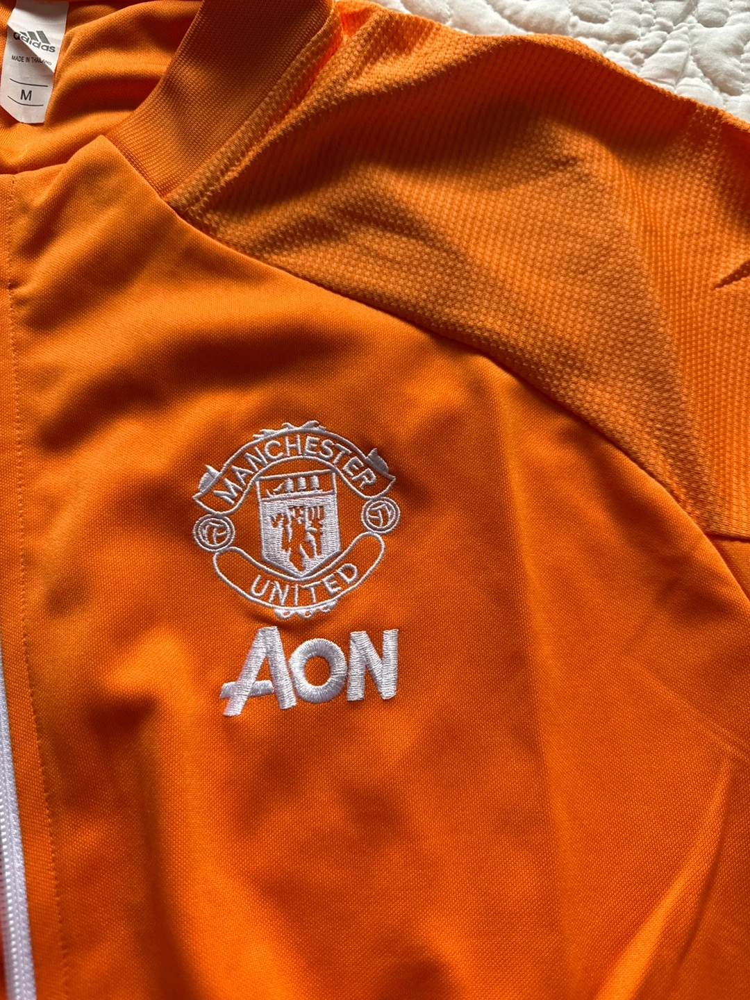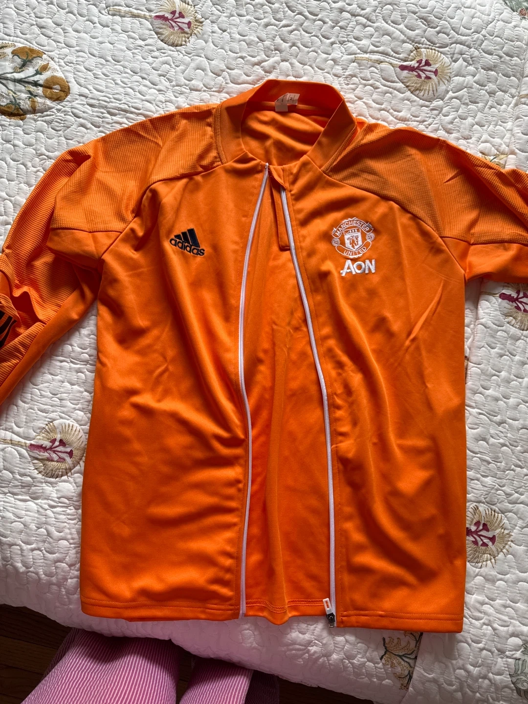 Orange Adidas track jacket with Manchester United crest. Full zip closure. Size is medium.
