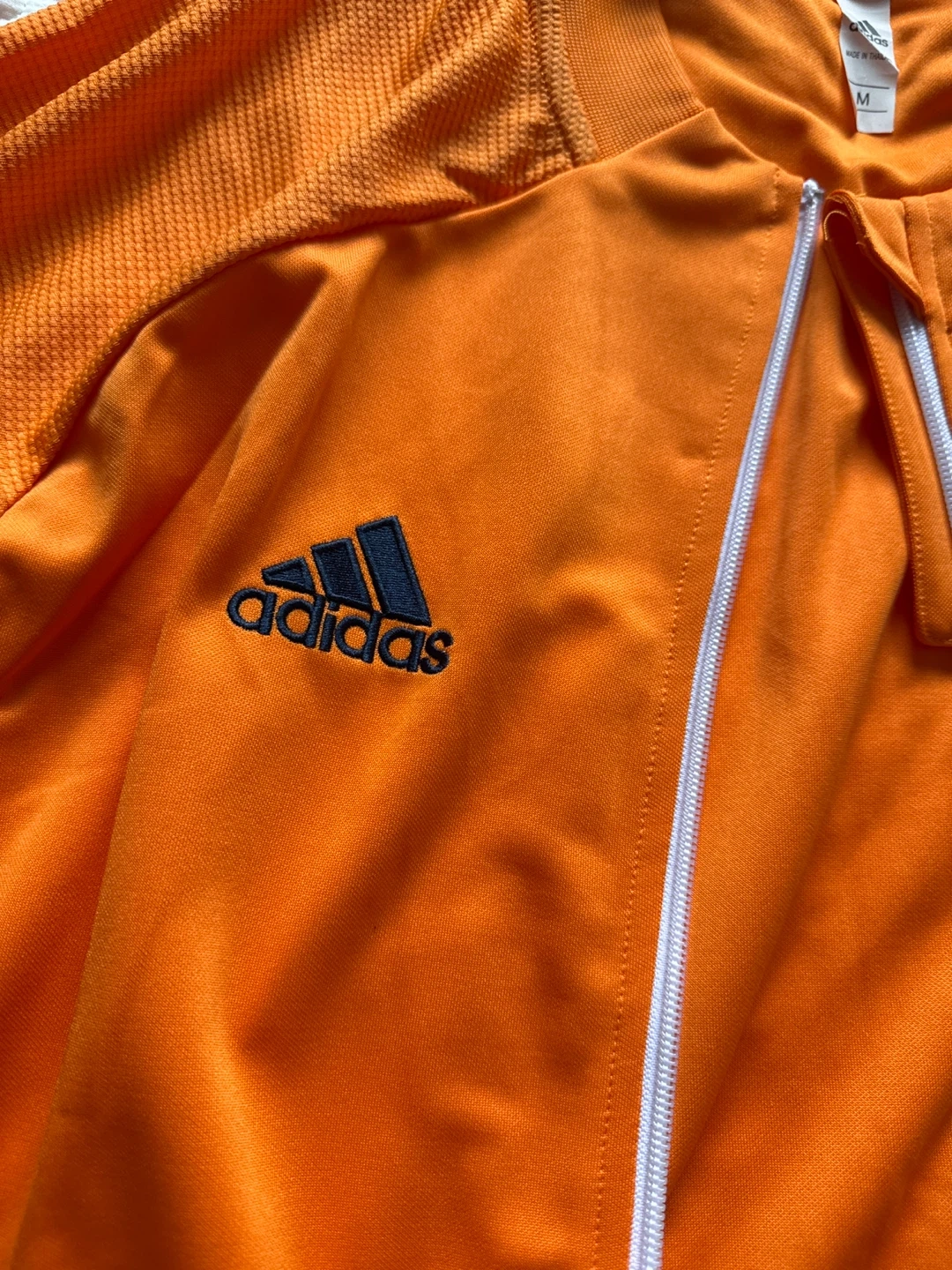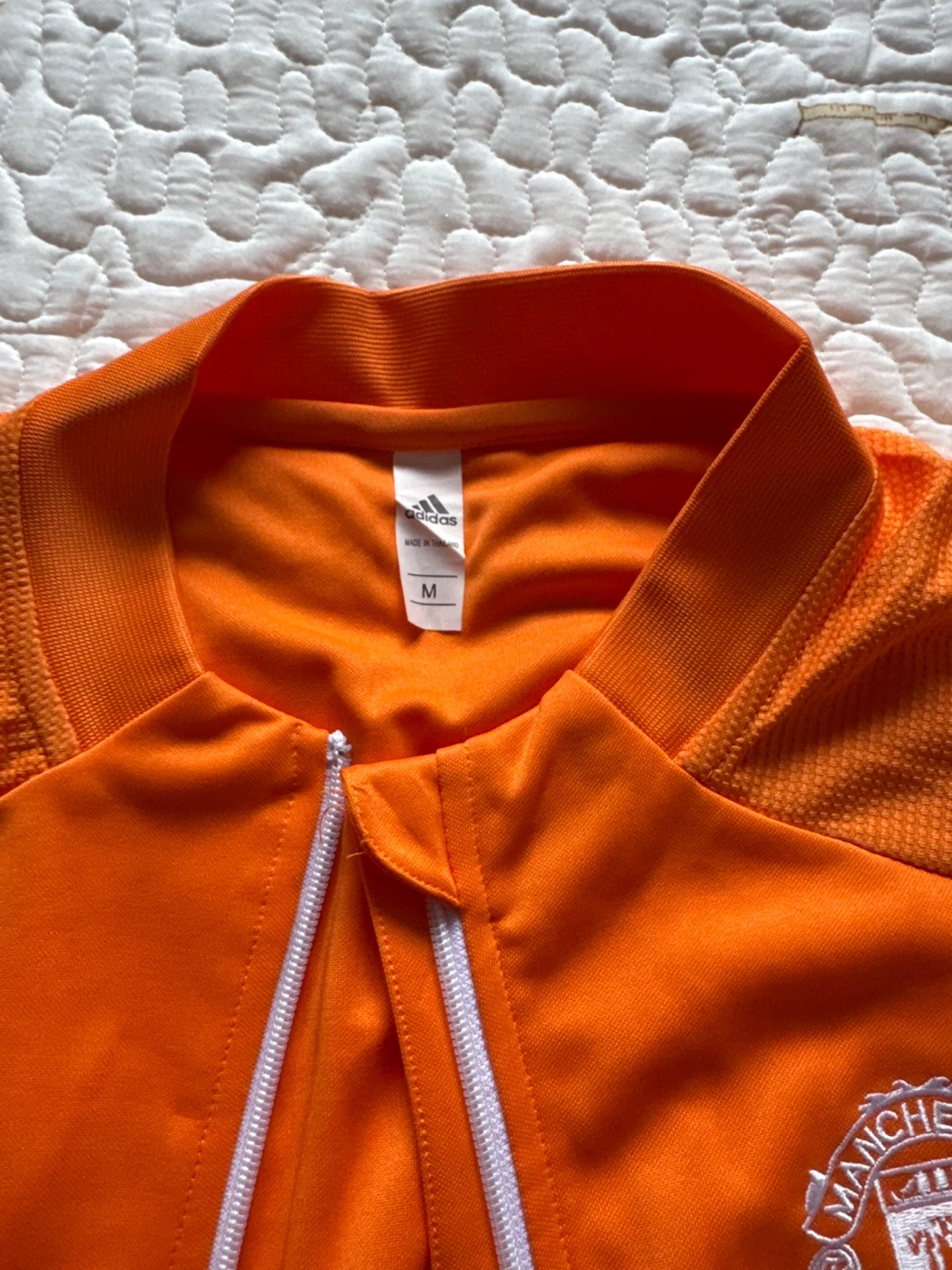 Orange Adidas track jacket with Manchester United crest. Full zip closure. Size is medium.