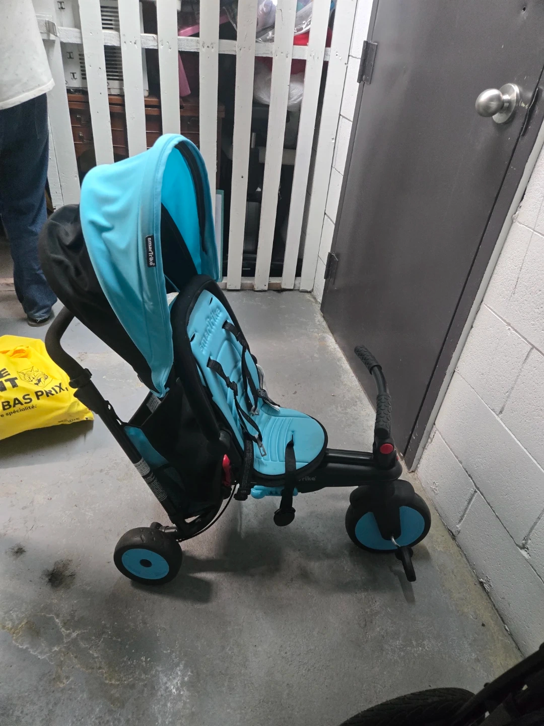 This is a blue and black Smartrike convertible tricycle. It features a comfortable seat and harness for younger riders. It's suitable for toddlers and can grow with them as they get older.