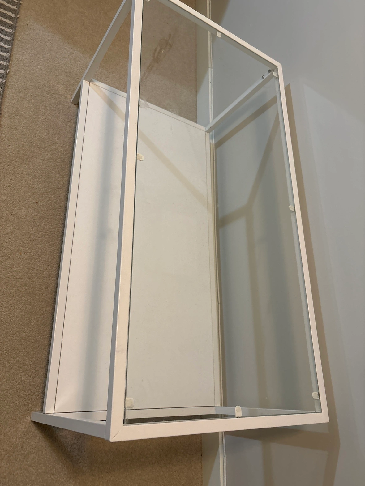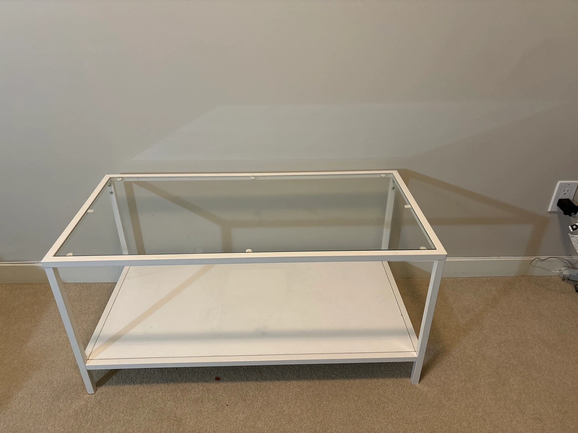 This is a white coffee table with a glass top and a lower shelf. It is sturdy and would be a great addition to any living room. Pick up only.