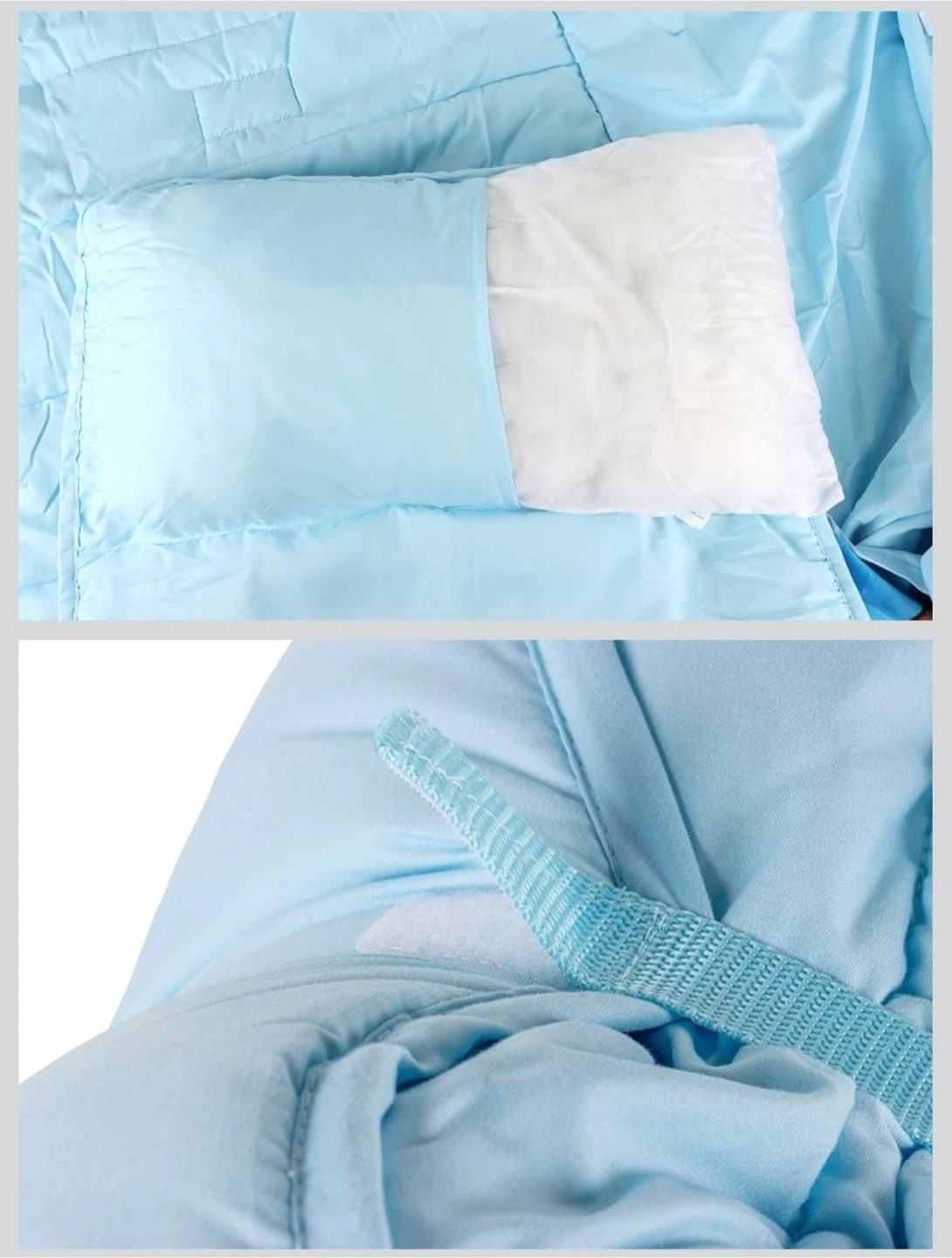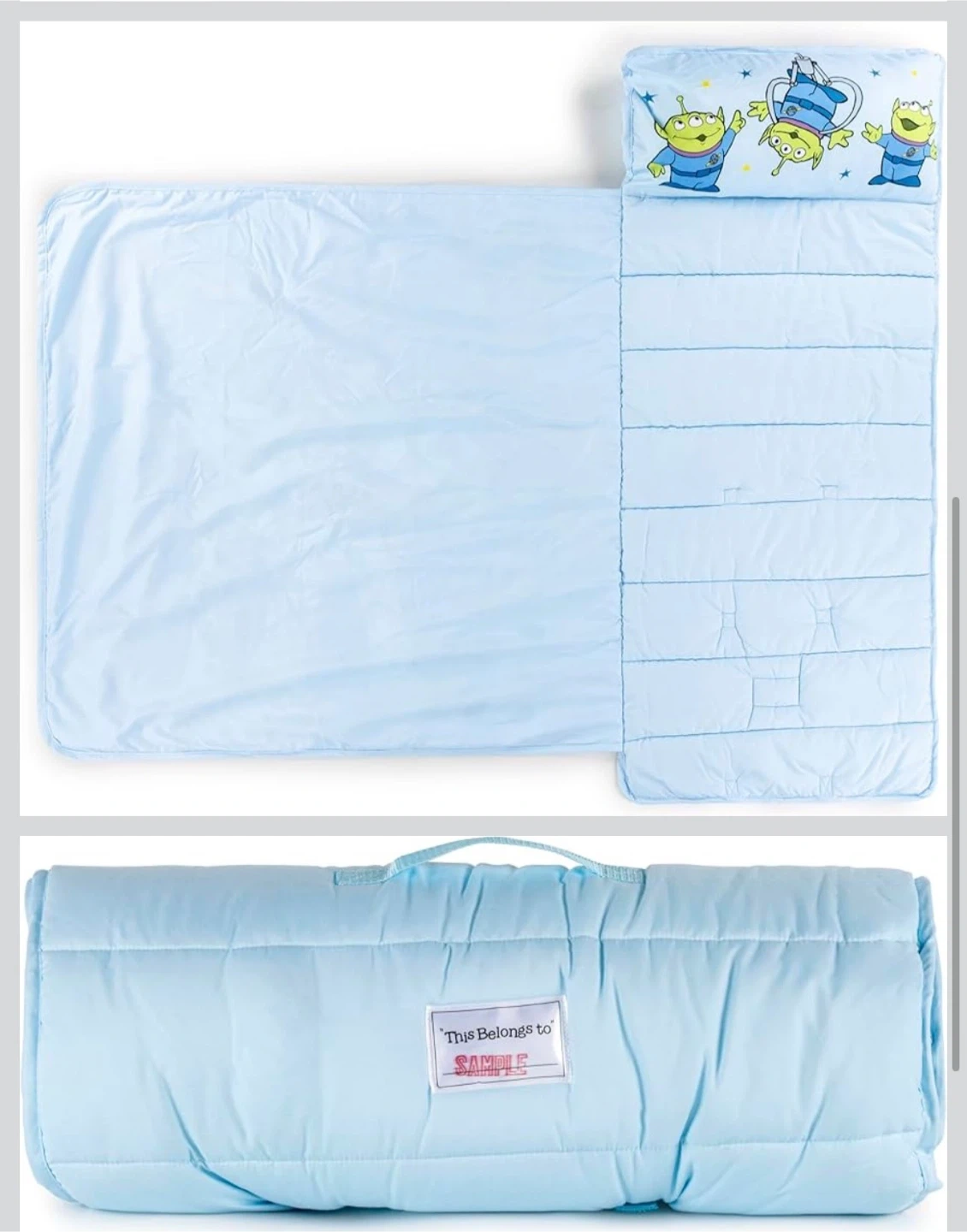This nap mat features Woody, Buzz Lightyear, and Jessie from Toy Story. It includes a pillow and rolls up for easy storage with a handle. It's perfect for daycare or travel!