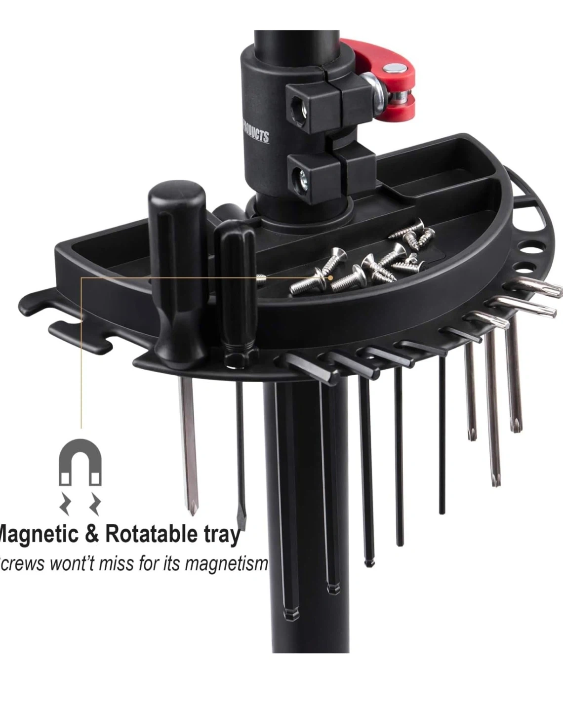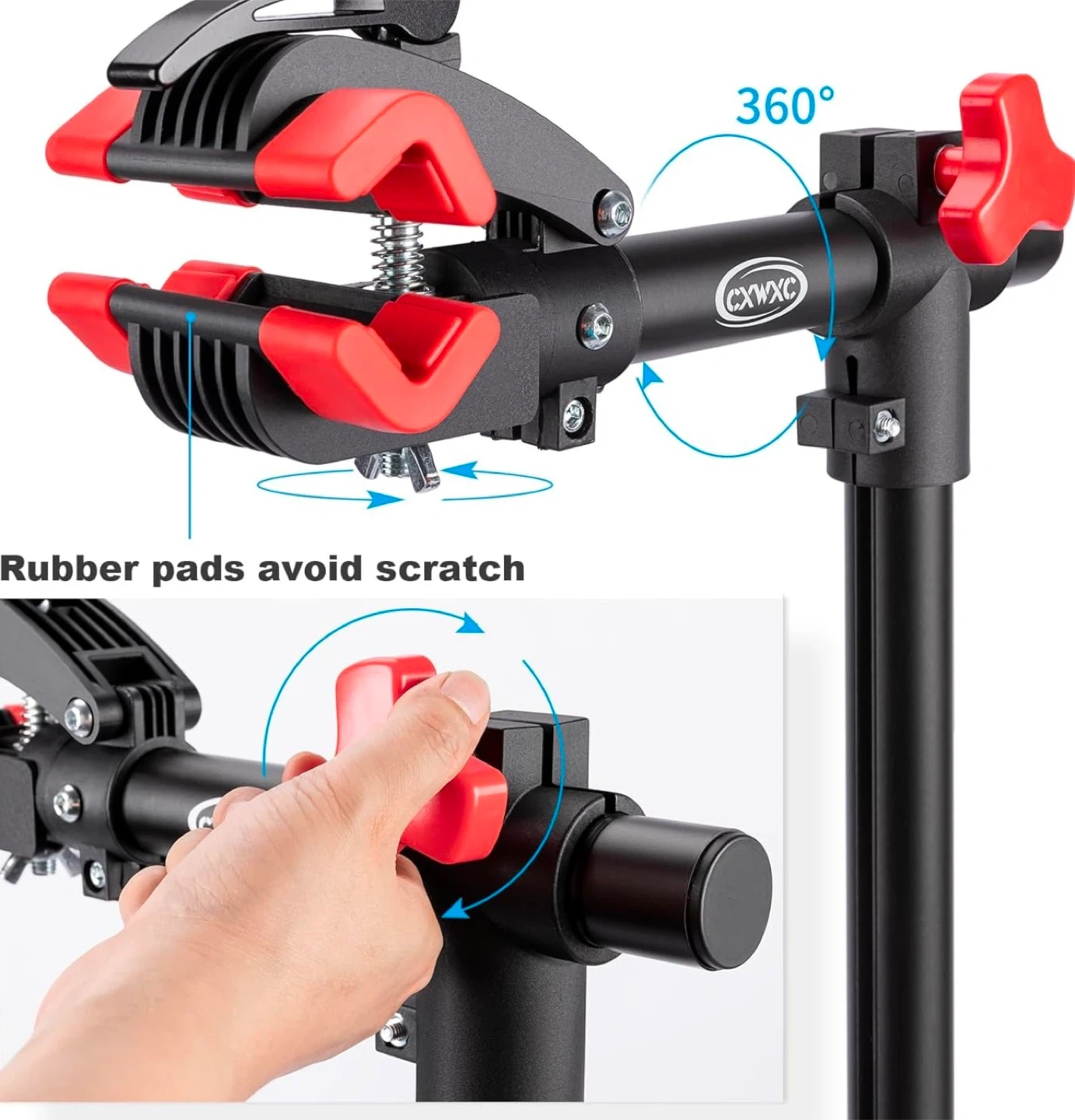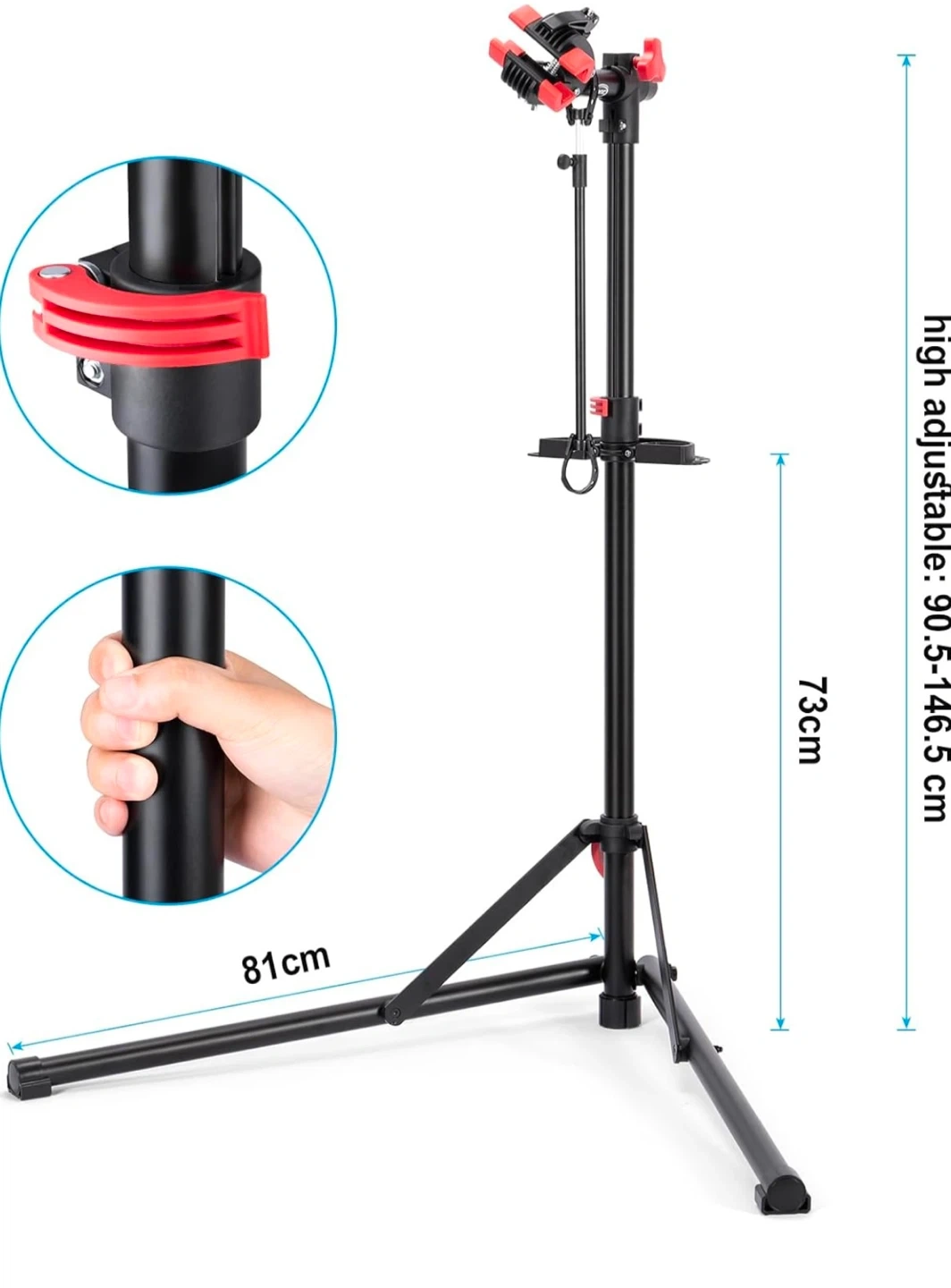 This sturdy bike repair stand features a 360-degree rotating clamp with rubber pads to avoid scratches. It's height adjustable from 90.5 to 146.5 cm and includes a magnetic, rotatable tray for tools and screws. A great stand for bike maintenance!