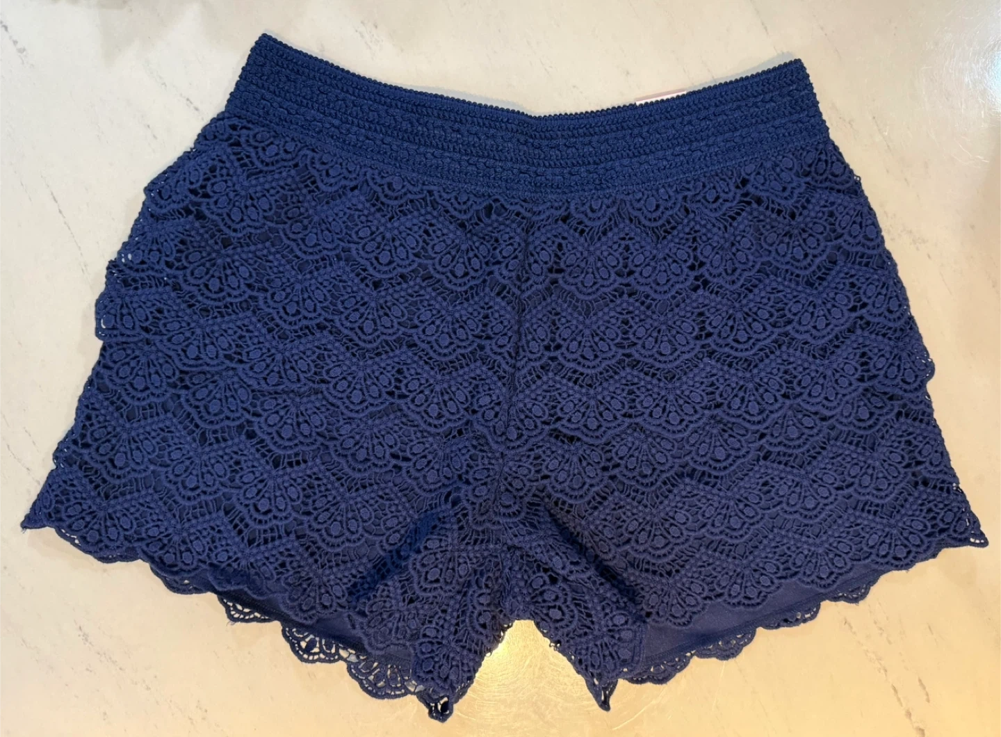These are Justice girls' navy blue crochet shorts. They feature an elastic waistband for comfort.