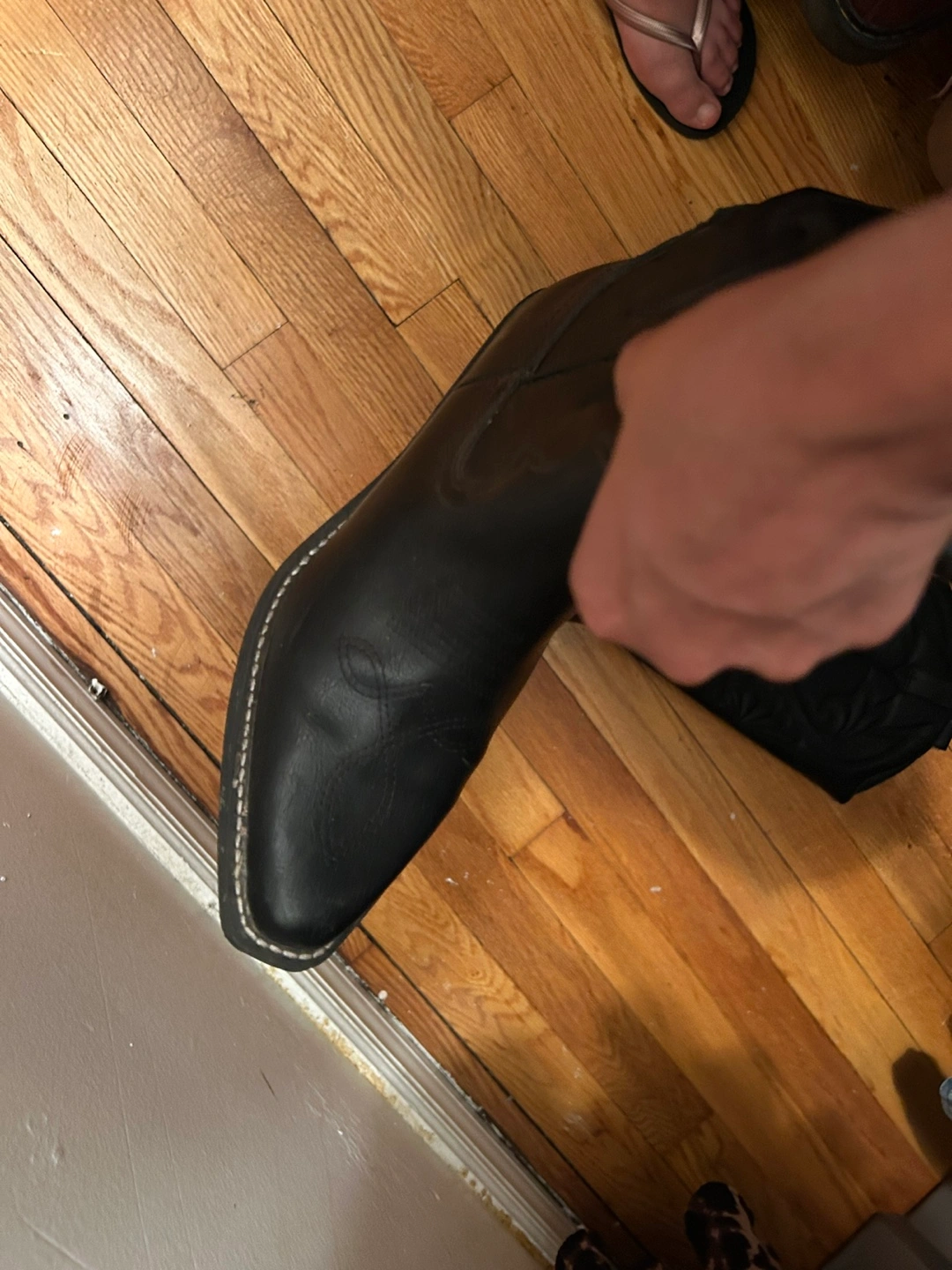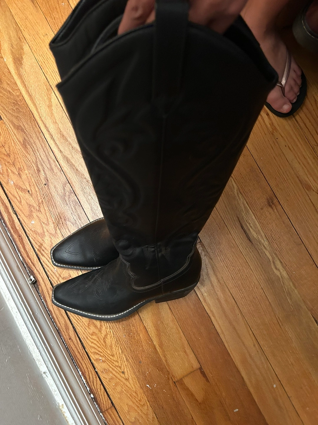 Selling a pair of black leather cowboy boots! They have a classic western design with decorative stitching and a comfortable fit. Perfect for adding some style to your outfit. They are in good condition!