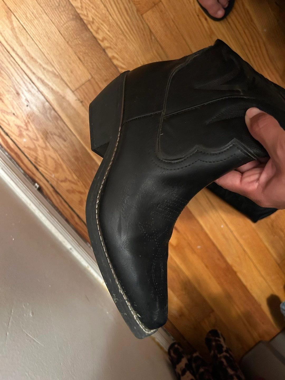 Selling a pair of black leather cowboy boots! They have a classic western design with decorative stitching and a comfortable fit. Perfect for adding some style to your outfit. They are in good condition!