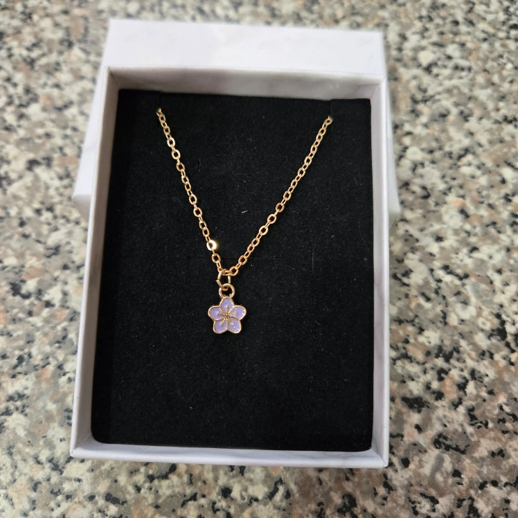 Add a touch of feminine grace to your outfit with this beautiful Lilac Enamel Flower Pendant Necklace. The pendant is crafted with intricate detailing and hangs from an 8" gold cable chain. The lobster closure ensures a secure fit. This necklace is perfect for a birthday gift or for adding a touch of magic to your daily wardrobe. The flower pendant represents love, beauty, appreciation, beauty, change, transformation, and hope. Made in China, this necklace will come in a marble-like gift box.