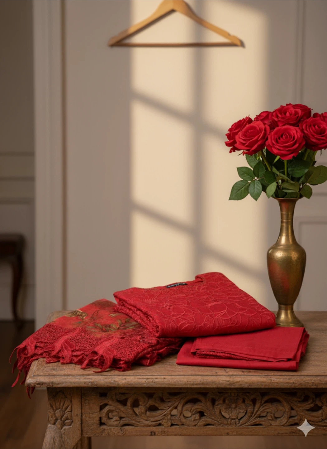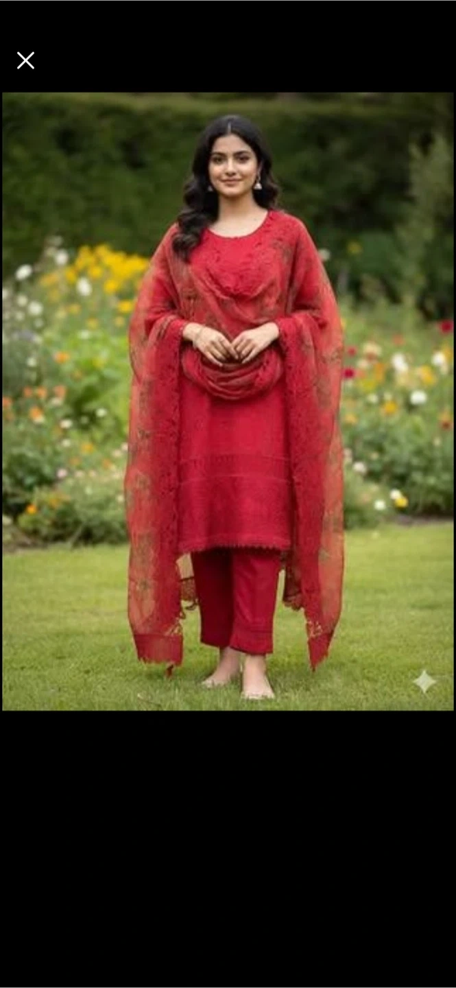 Beautiful deep red 3-piece cotton cutwork suit with lining and a soft organza laced dupatta with cutwork.