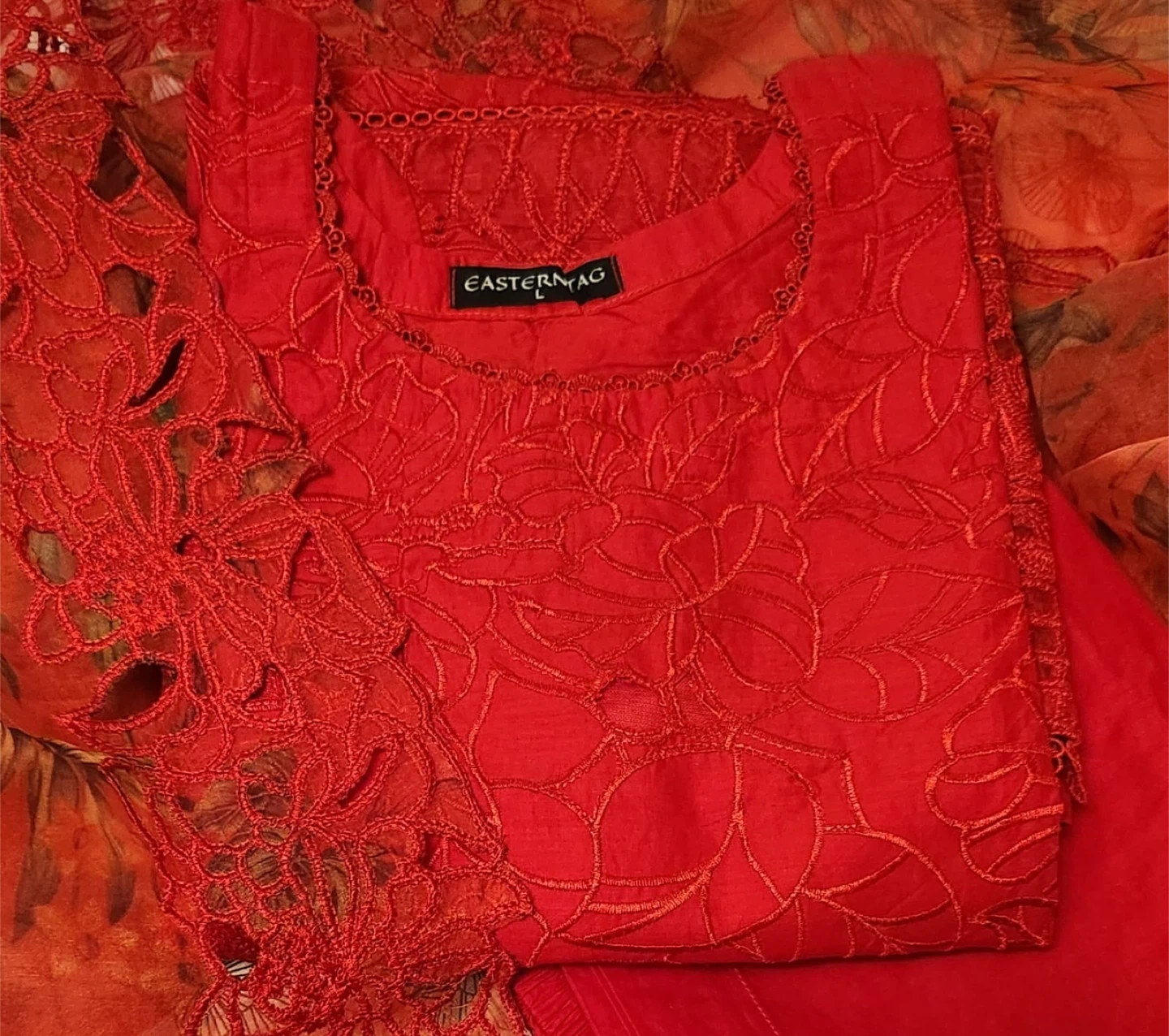 Beautiful deep red 3-piece cotton cutwork suit with lining and a soft organza laced dupatta with cutwork.