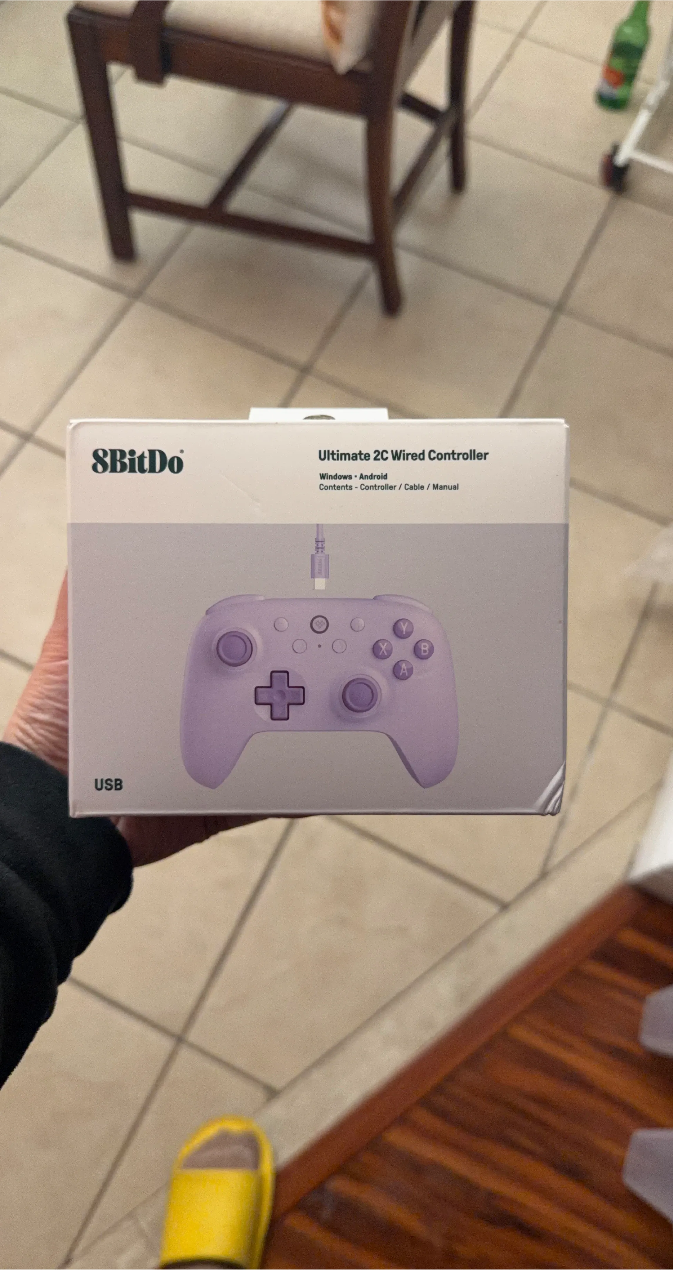 This is an 8BitDo Ultimate 2C Wired Controller in purple. It's compatible with Windows and Android devices. It includes the controller, a USB cable, and a manual.