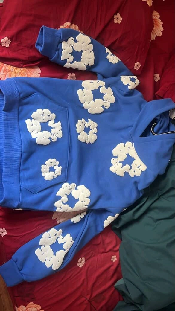 Blue danim tears Hoodie with White Cloud Design