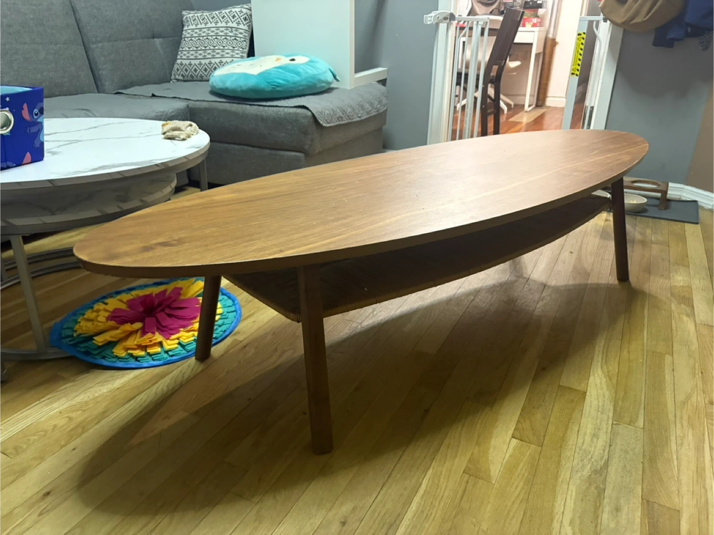 Selling a West Elm mid-century modern coffee table! It's in great shape and would look great in any living room. It has a unique oval shape and a lower shelf for storage or decor. The wood finish is warm and inviting