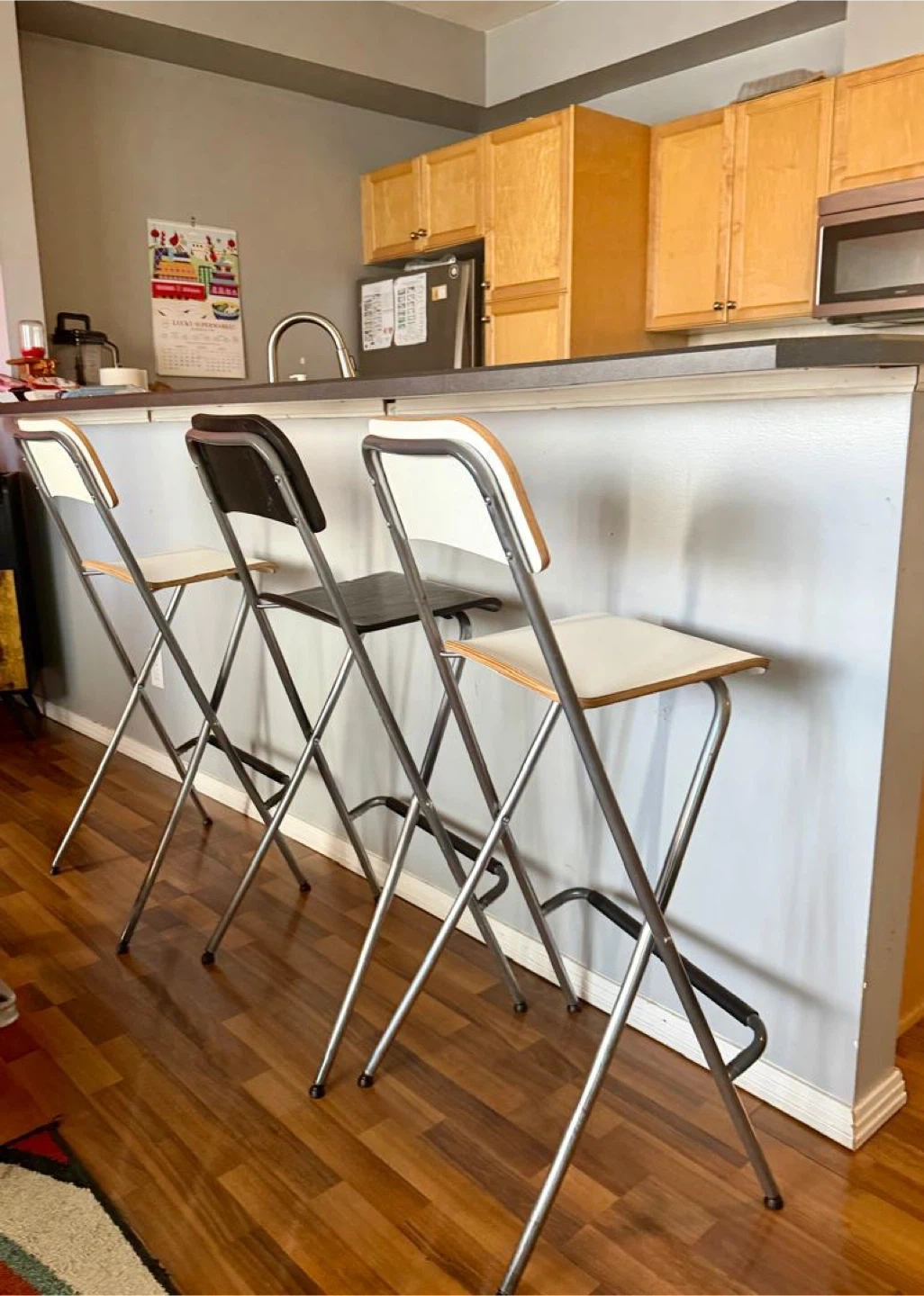 Set of three folding bar stools. Two feature white seats and backs, while one has a black seat and back. Metal frame with footrests. Great for extra seating!