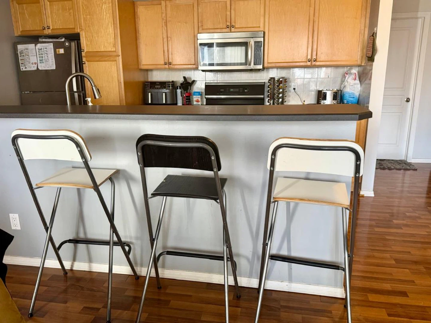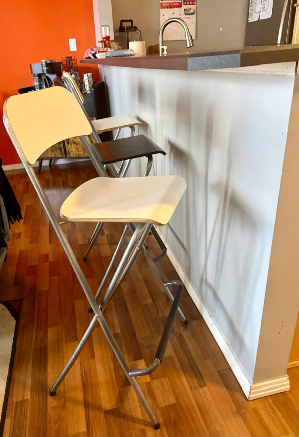 Set of three folding bar stools. Two feature white seats and backs, while one has a black seat and back. Metal frame with footrests. Great for extra seating!
