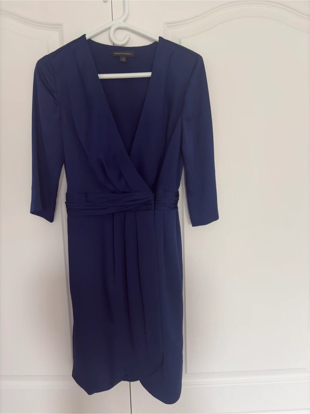 Banana Republic navy blue wrap dress with a tie waist. It has a V-neck and three-quarter sleeves. This dress is suitable for professional or evening wear.