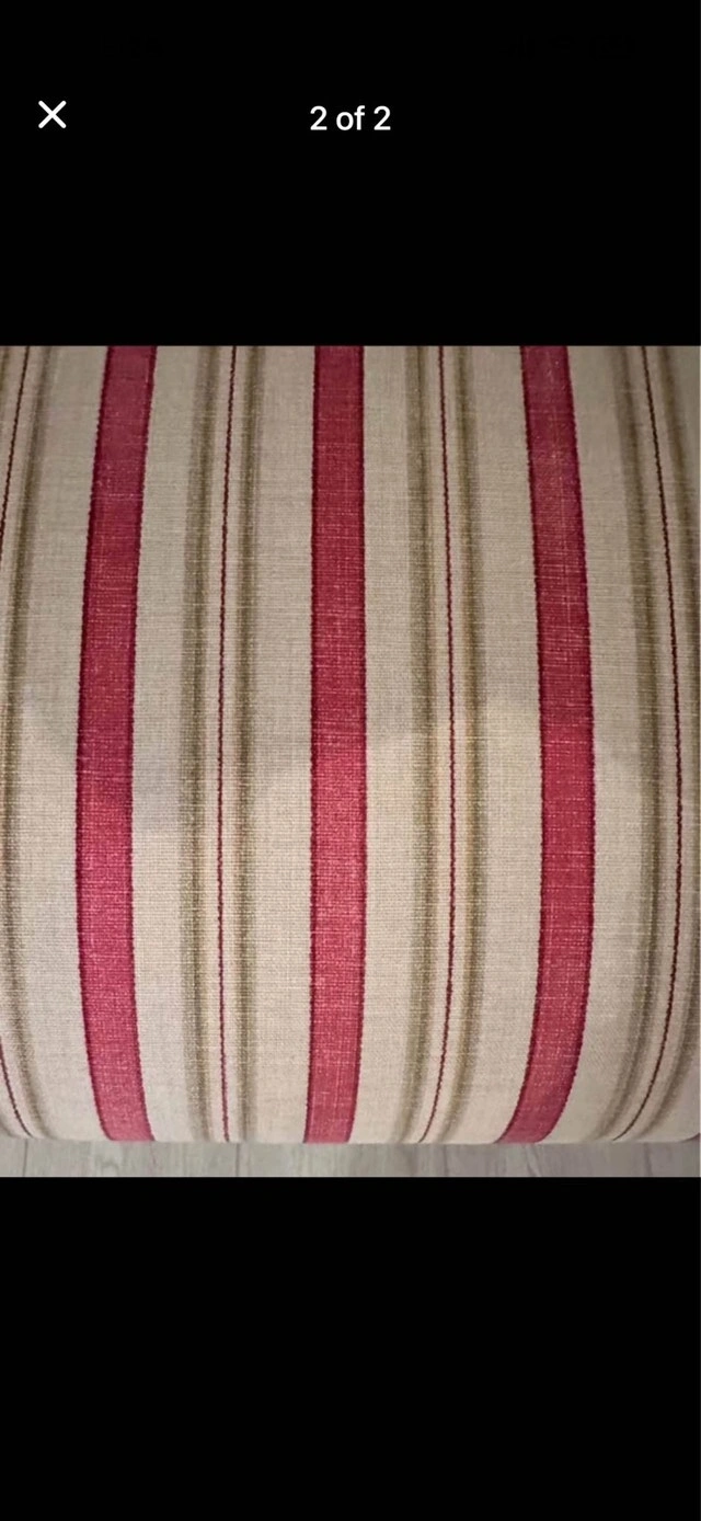 51" long x 23" deep x 17" high. Foam is in great shape. Use for display or sitting. Wood frame with thick solid coils underneath. Colour is a fuchsia / green / cream stripe. Smoke-free, pet-free home. Steam cleaned. Cashless payment accepted. Cash accepted. Curbside pick up only.