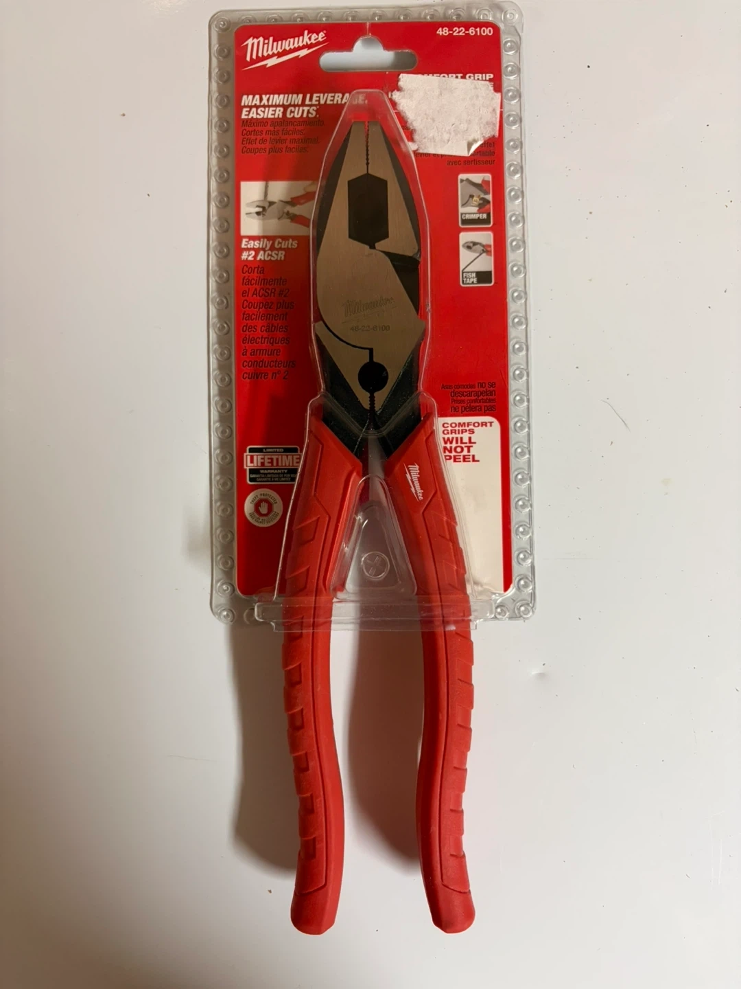 Milwaukee 9-inch high leverage linesman pliers with wire cutter and integrated crimper. Features comfort grip handles that won't peel. Easily cuts #2 ACSR.