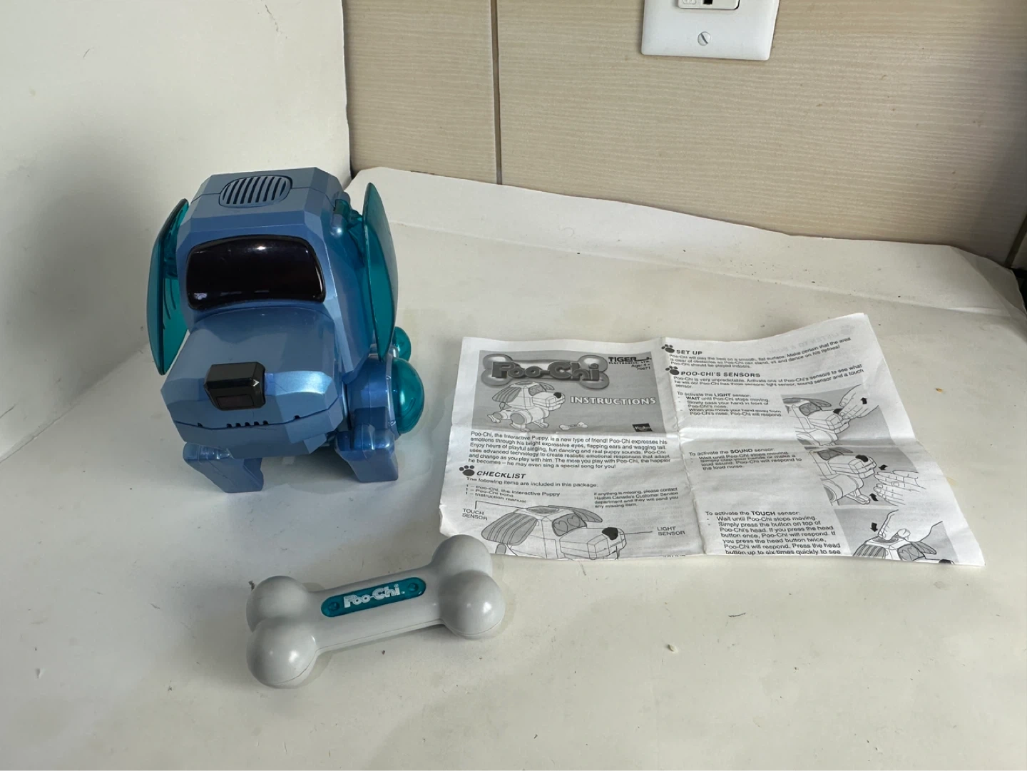 The Poo-Chi robot puppy is a blue interactive toy dog. It comes with a bone and instructions. It expresses emotions through sound and movement.