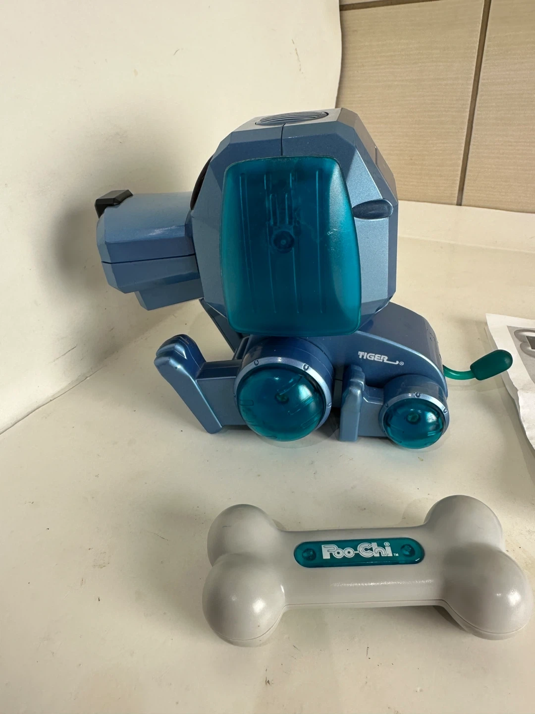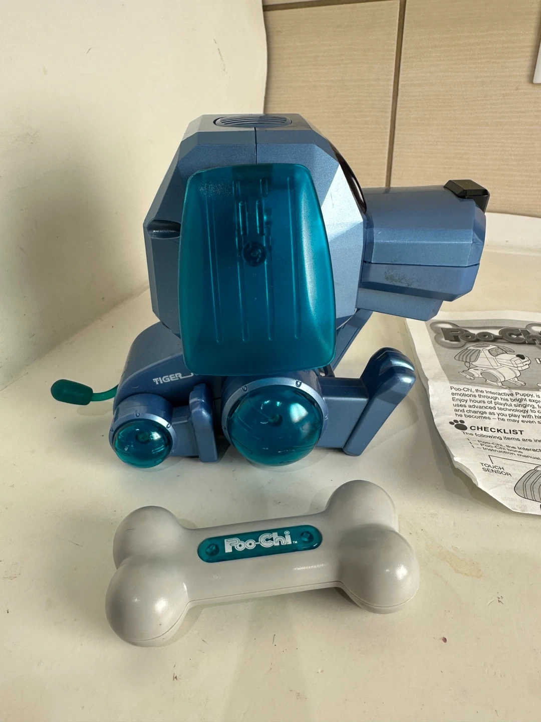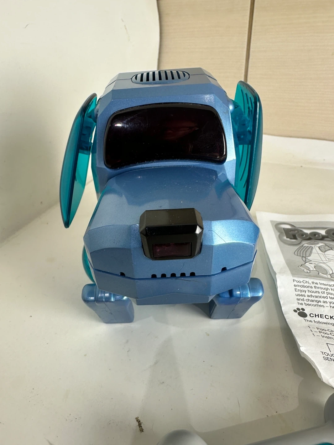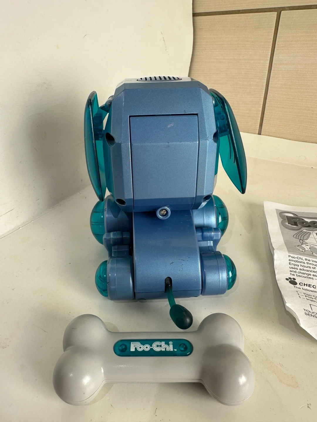 The Poo-Chi robot puppy is a blue interactive toy dog. It comes with a bone and instructions. It expresses emotions through sound and movement.