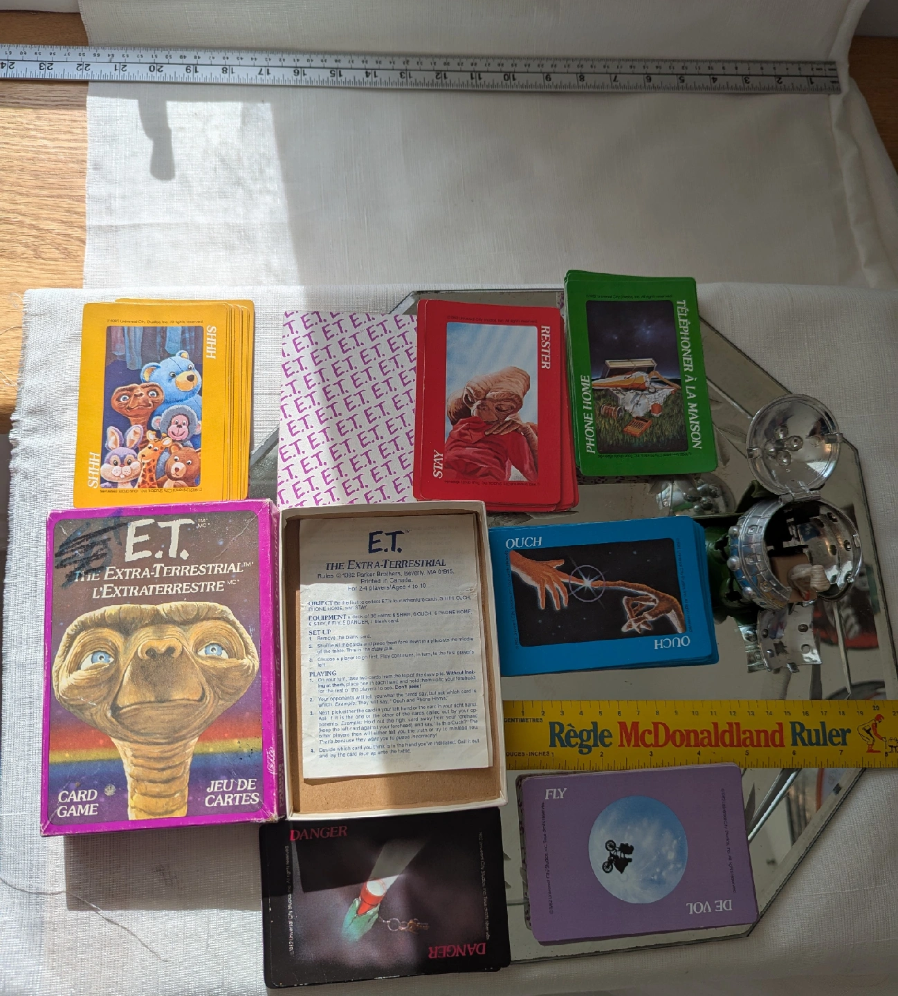 Selling an E.T. The Extra-Terrestrial card game and toy. The toy is a spaceship with a small E.T. figure inside from 1982. The card game includes instructions.