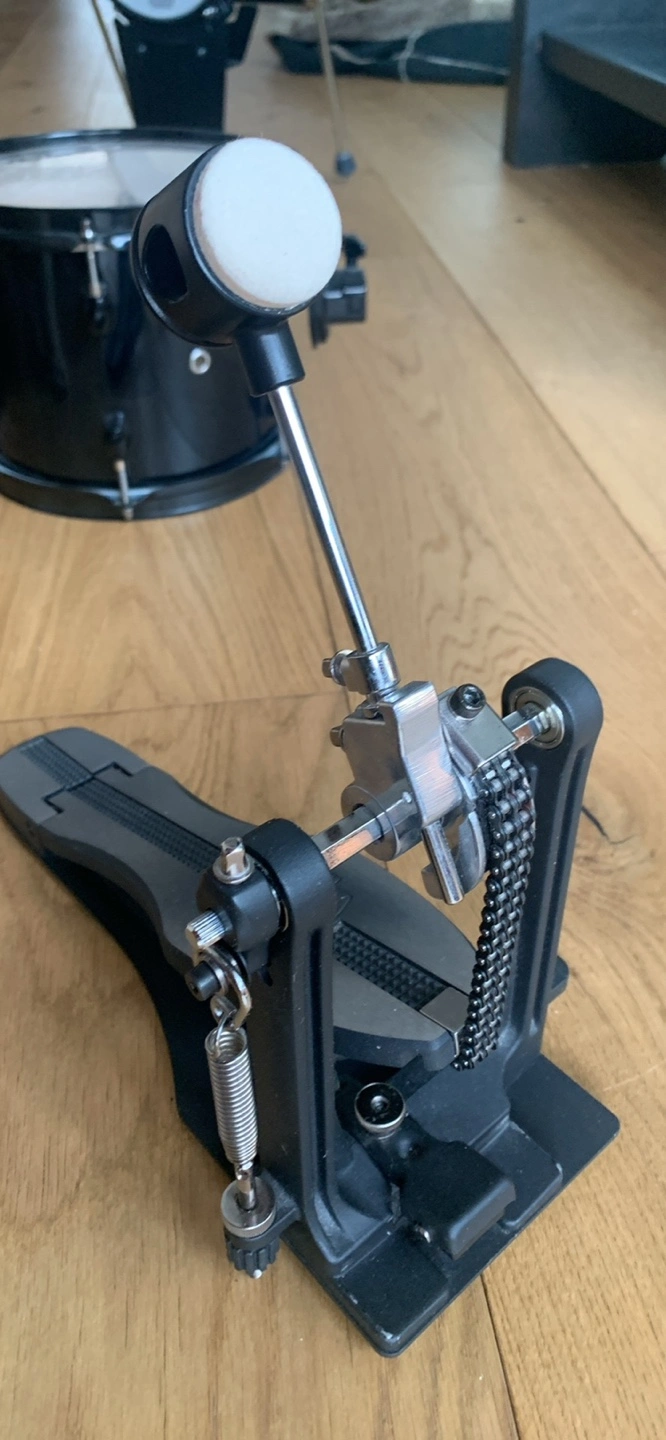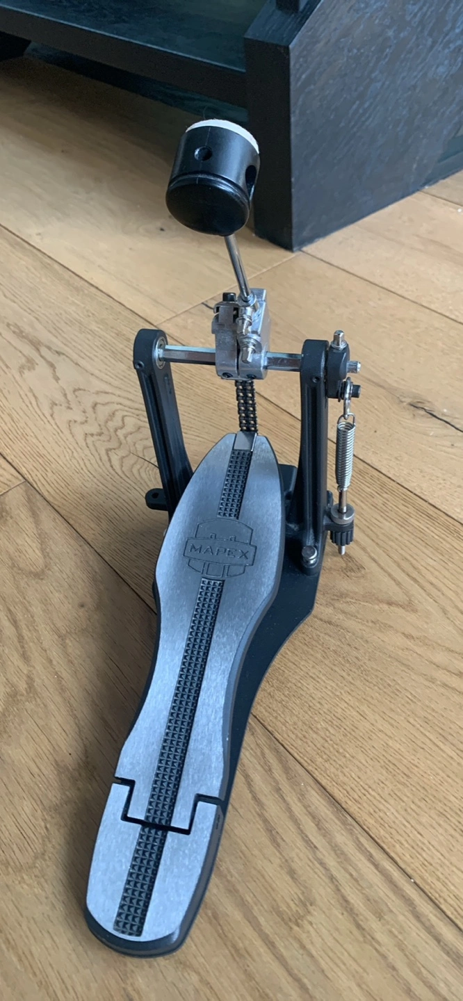 Used Mapex P300 single bass drum pedal. Good condition. Chain drive mechanism. Includes beater. Great for practice or smaller gigs.