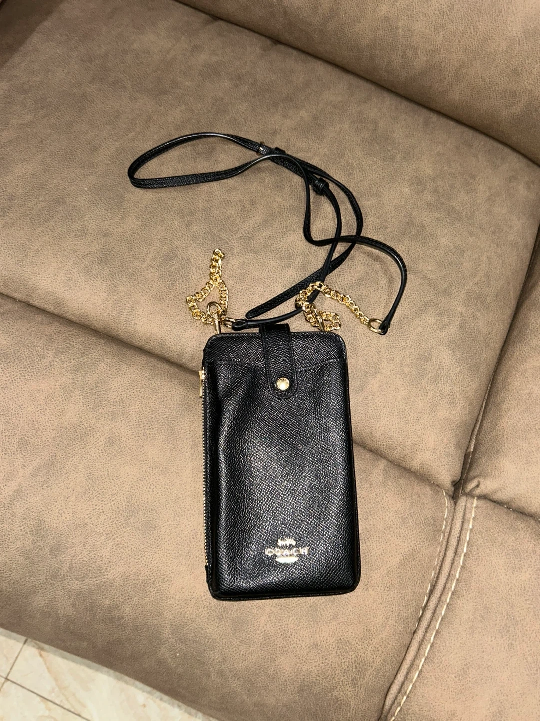 This is a black leather crossbody bag from Coach. It features a zippered compartment and a strap with a gold chain accent. It's designed to hold a phone and essentials.