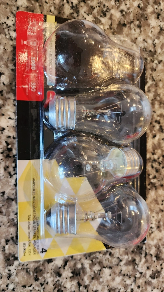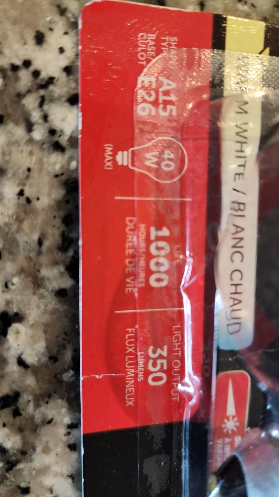 Open pack of 3 A15 light bulbs. These are 40W bulbs with a light output of 350 lumens. They have a lifespan of 1000 hours. Great for various lighting needs!
