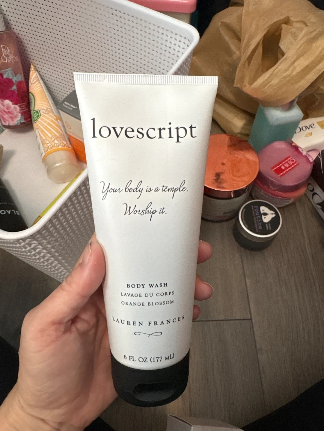 This is a 6 fl oz (177 mL) bottle of Lovscript body wash. It features an orange blossom scent. This wash is for your body.