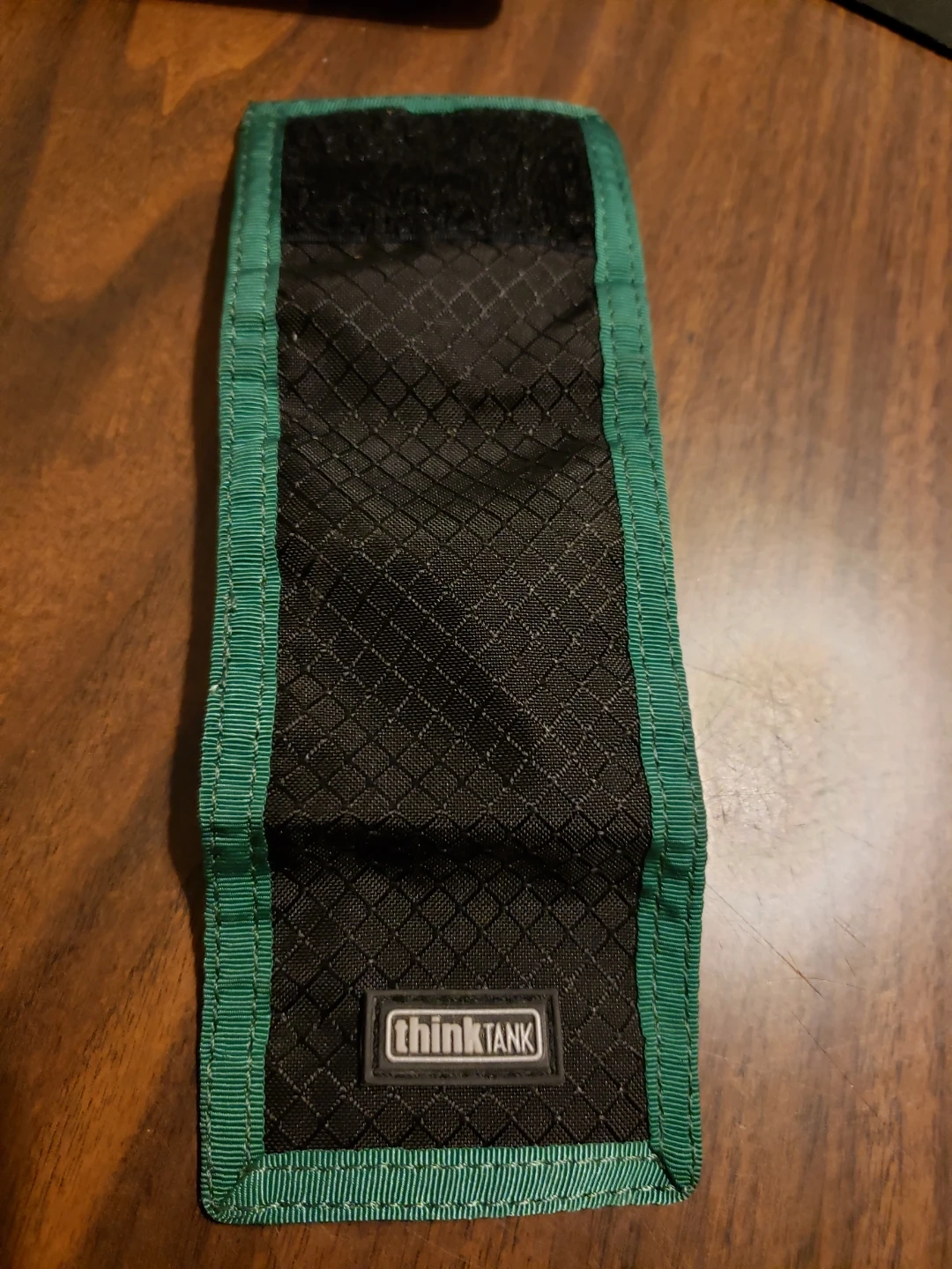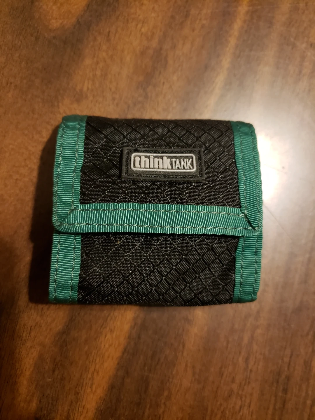 This Think Tank wallet is black with green trim and velcro closure. It's made of durable nylon material and features multiple compartments inside for organization. A compact pouch for AA batteries. Think Tank quality gear for photography