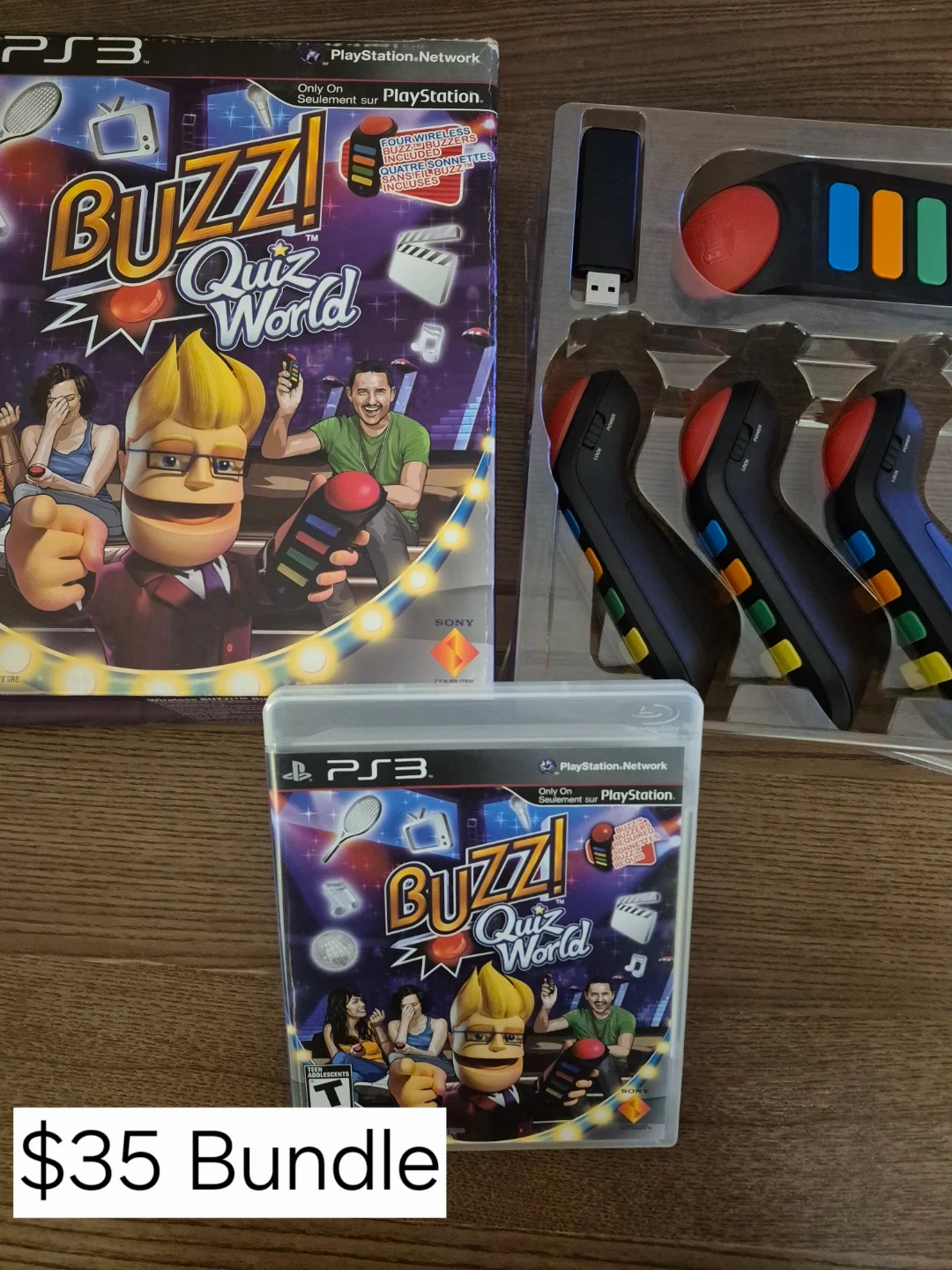 Get ready for some trivia fun with the Buzz! Quiz World bundle for PlayStation 3. This set includes the game and four coloured buzzers for multiplayer action. It's perfect for game nights with friends and family!