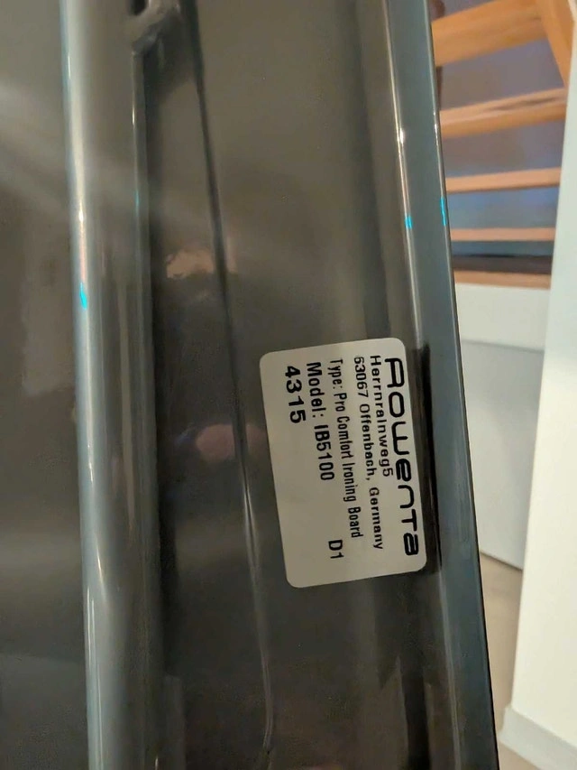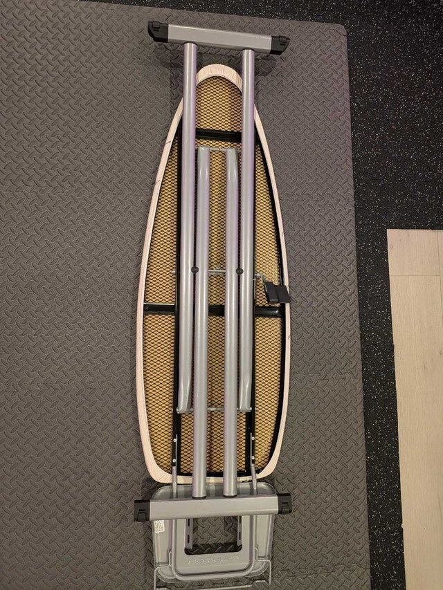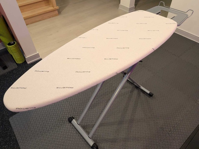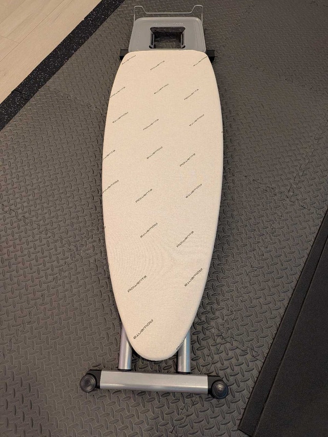 Selling a very lightly used Rowenta Pro Comfort adjustable ironing board. It has an integrated iron rest, wheels, and levers for adjusting height. Used only a handful of times.