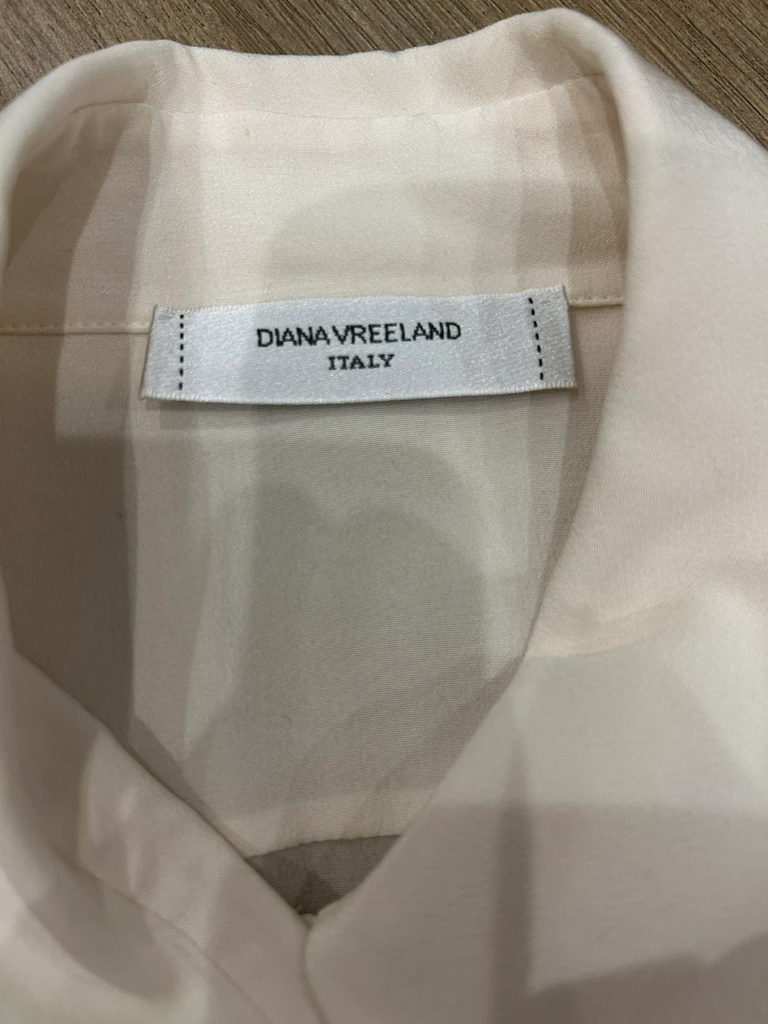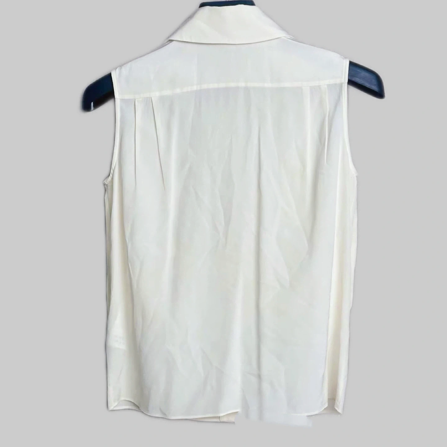 This sleeveless blouse is from DIANA VREELAND. It's a cream-coloured size 38. The fabric is lightweight and has a nice drape, perfect for warmer days.