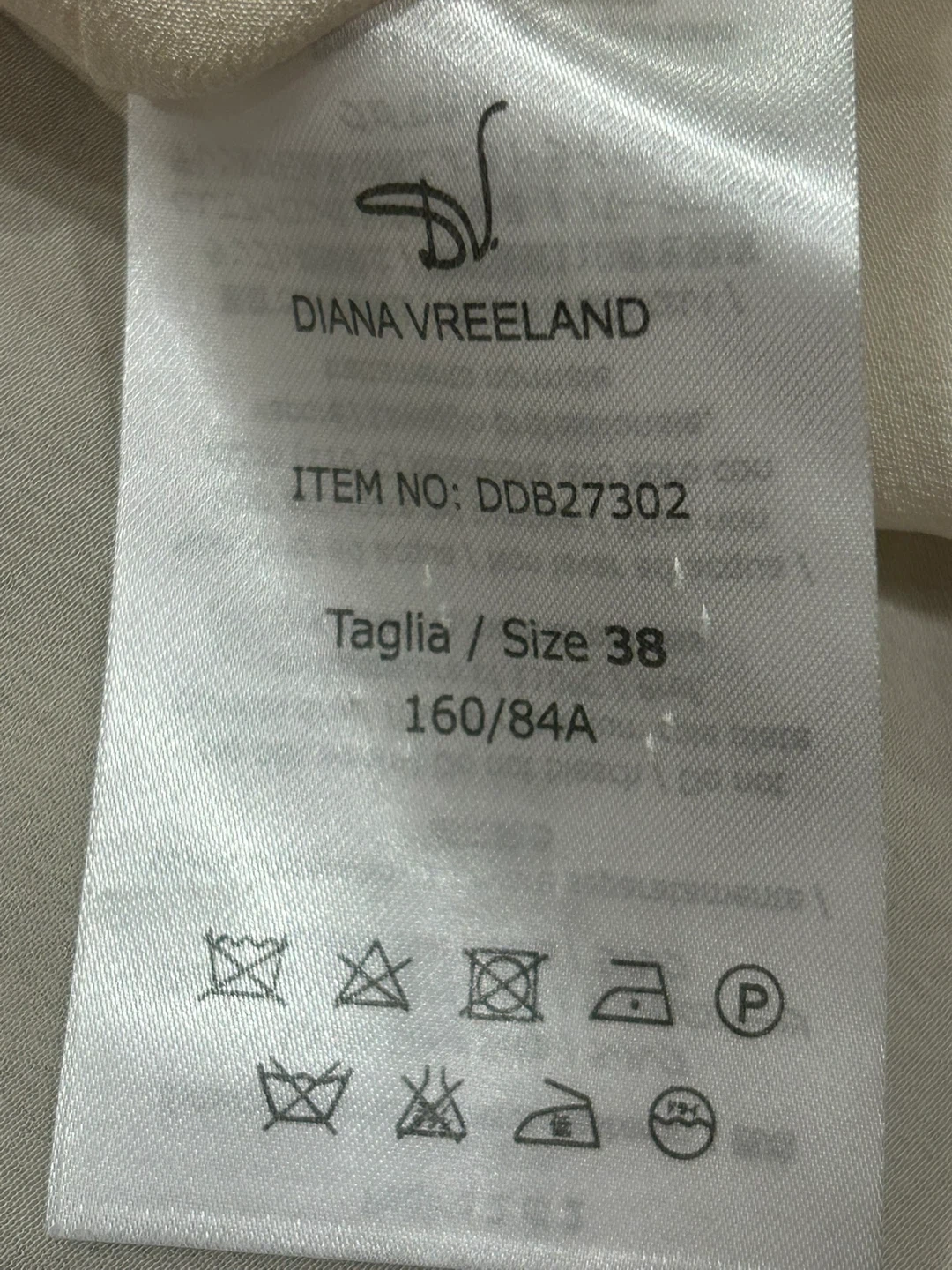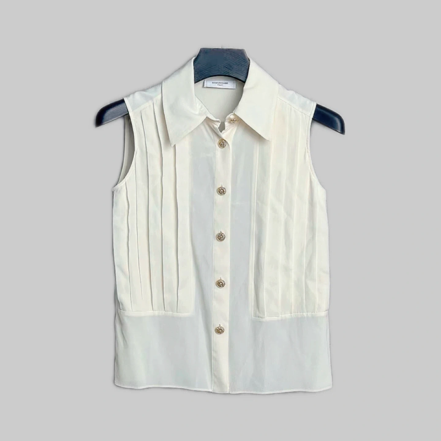 This sleeveless blouse is from DIANA VREELAND. It's a cream-coloured size 38. The fabric is lightweight and has a nice drape, perfect for warmer days.