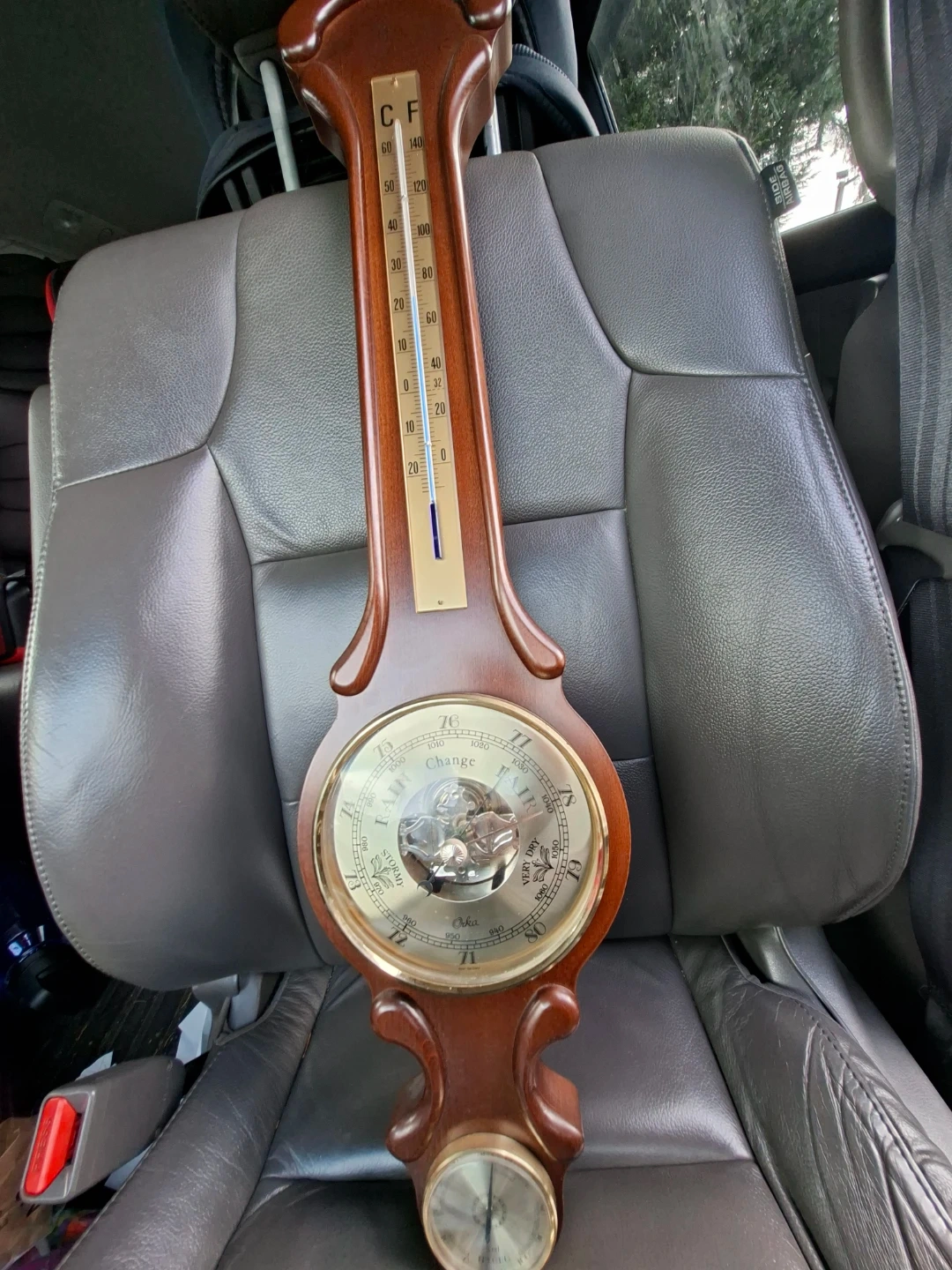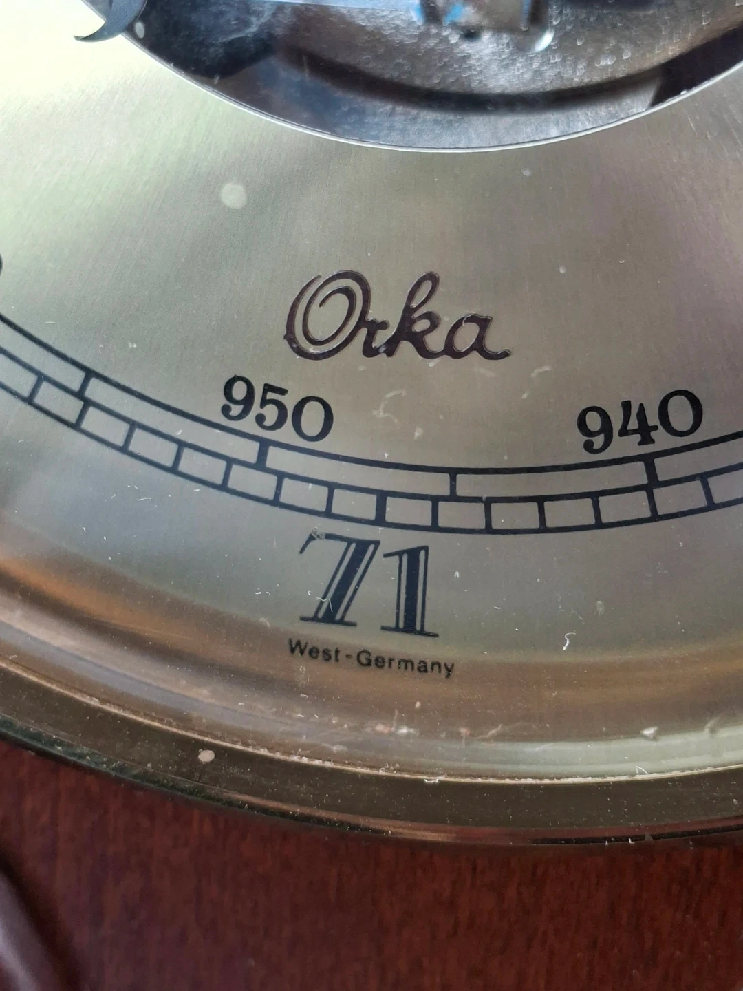 Vintage Orka barometer and thermometer made in West Germany. Features include a pressure gauge and a Fahrenheit/Celsius thermometer. Wooden casing and brass accents. Plastic mercury is cracked