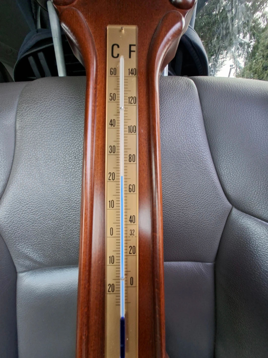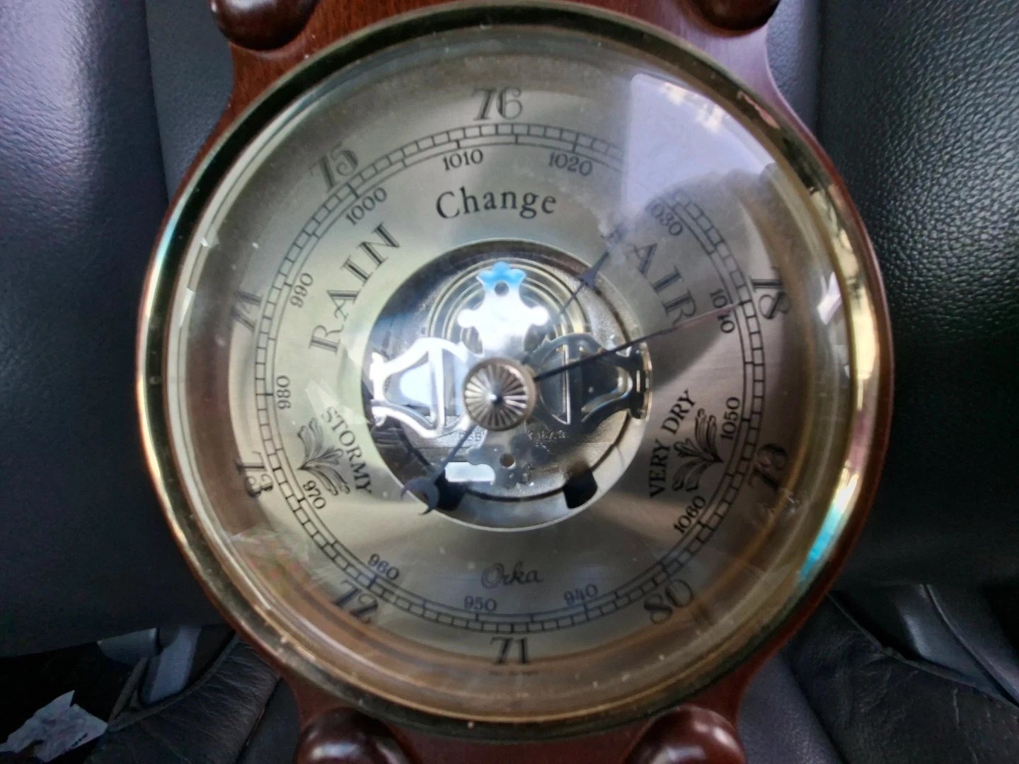 Vintage Orka barometer and thermometer made in West Germany. Features include a pressure gauge and a Fahrenheit/Celsius thermometer. Wooden casing and brass accents. Plastic mercury is cracked