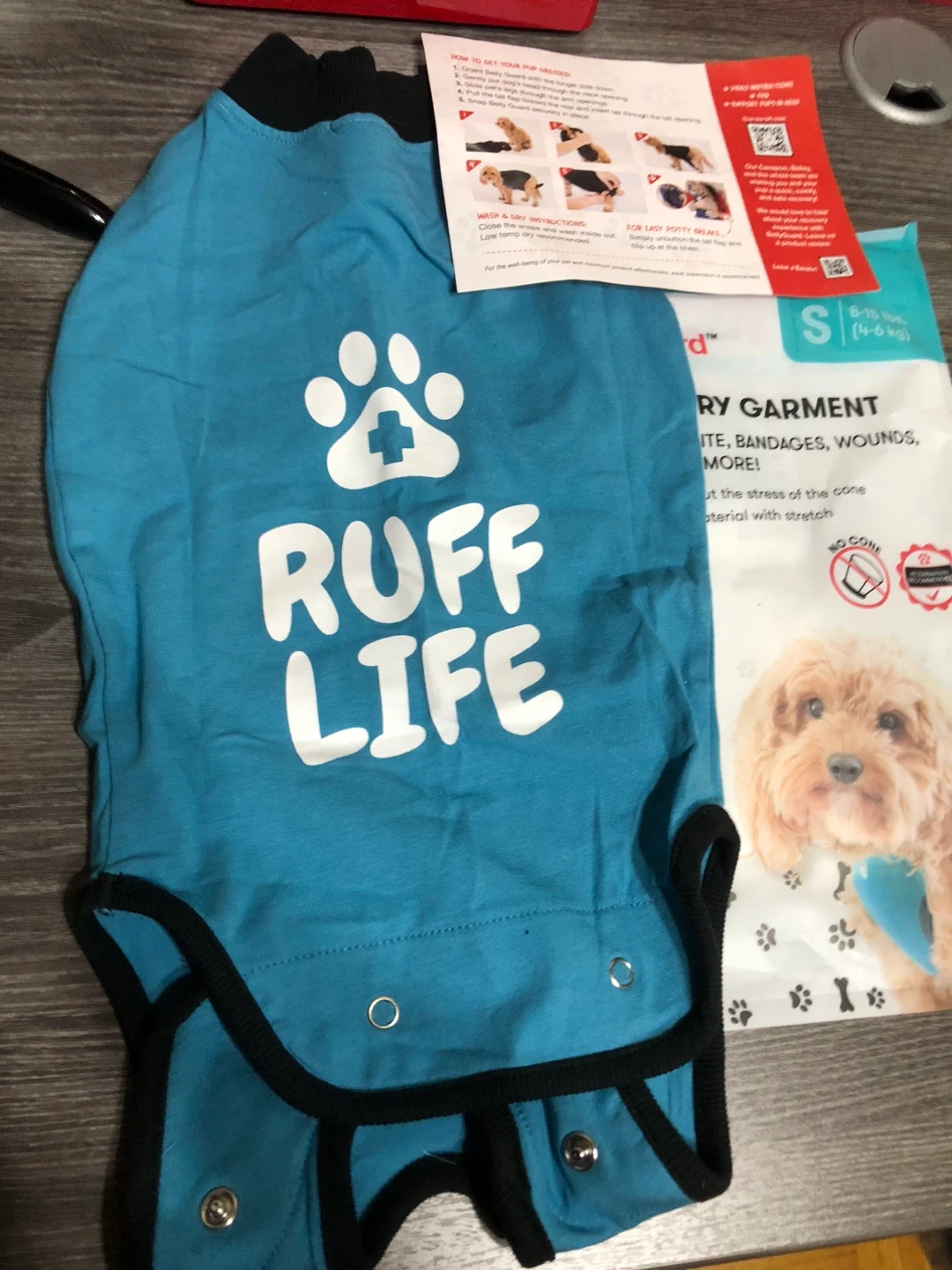 This is a BellyGuard dog recovery garment, designed to protect surgical sites, bandages, wounds and more! It's a size small, suitable for dogs weighing 8-15 lbs (4-6 kg). The garment is made from a comfortable cotton material with stretch and features a convenient snap closure. It's also machine washable!