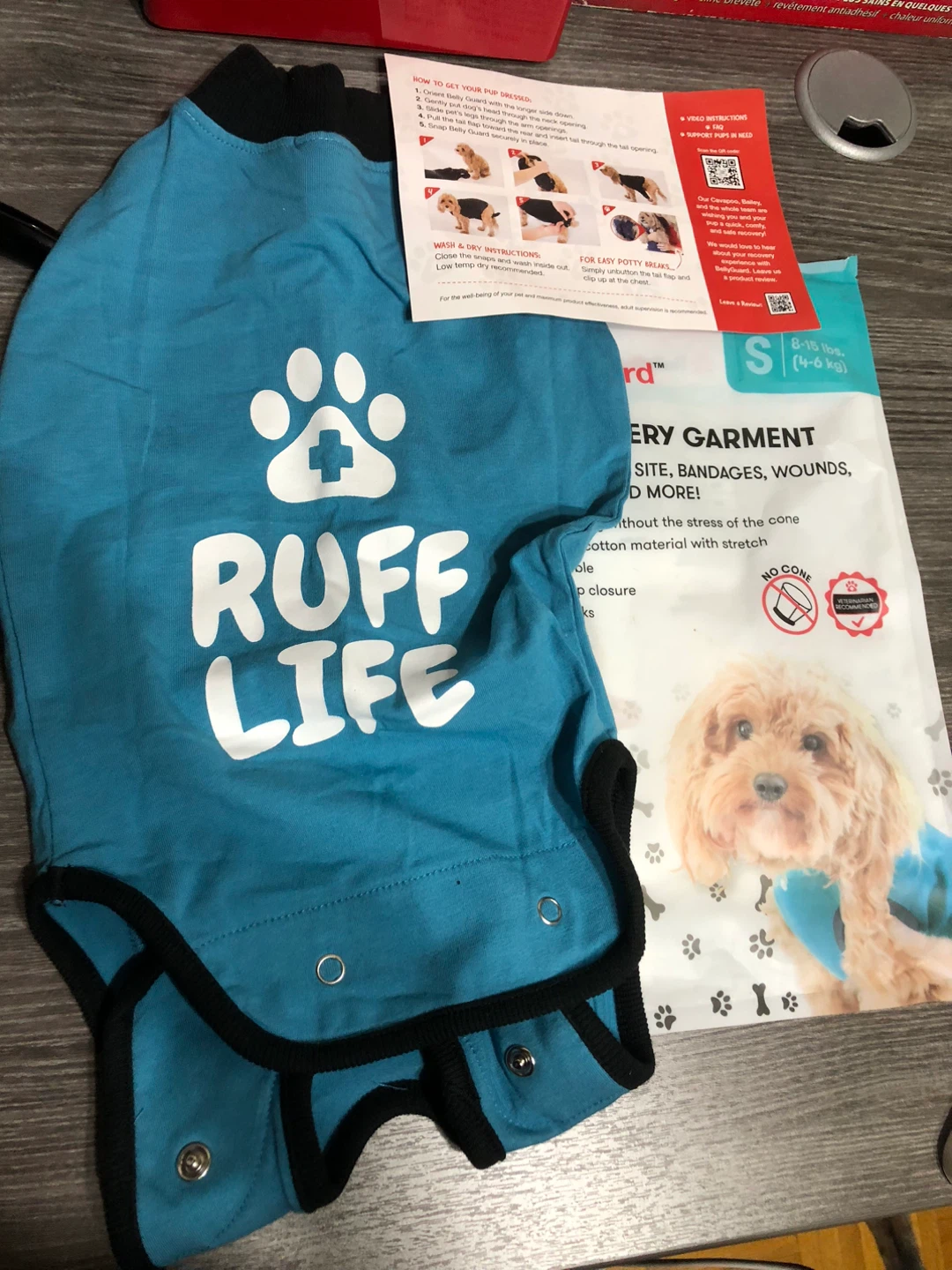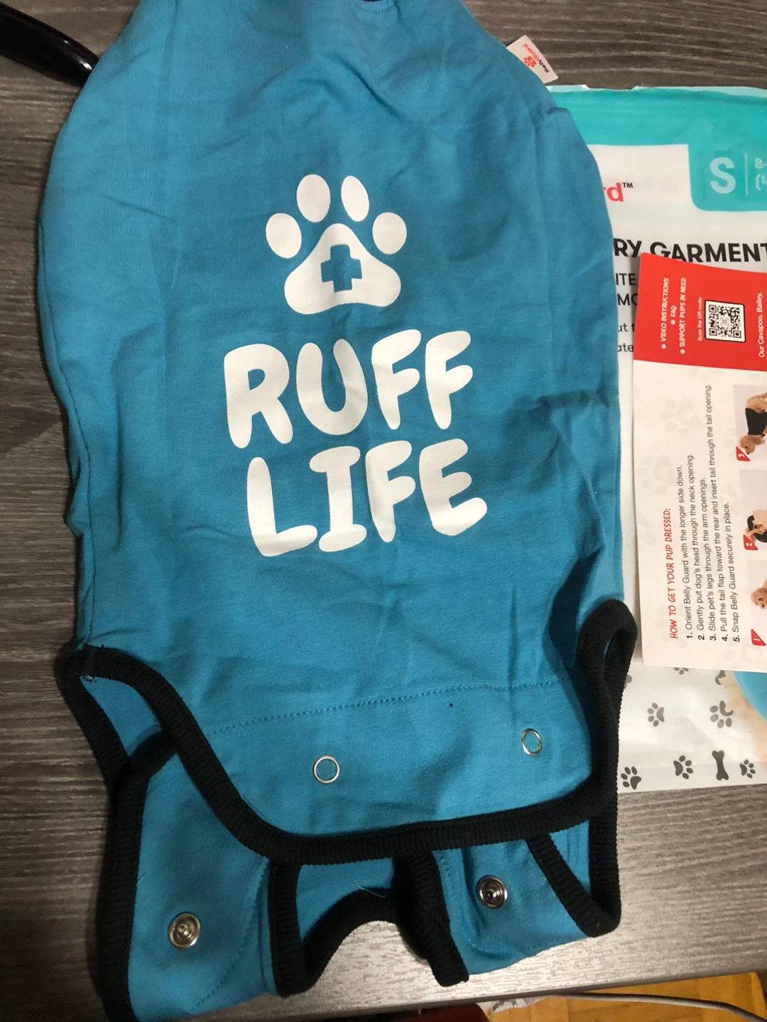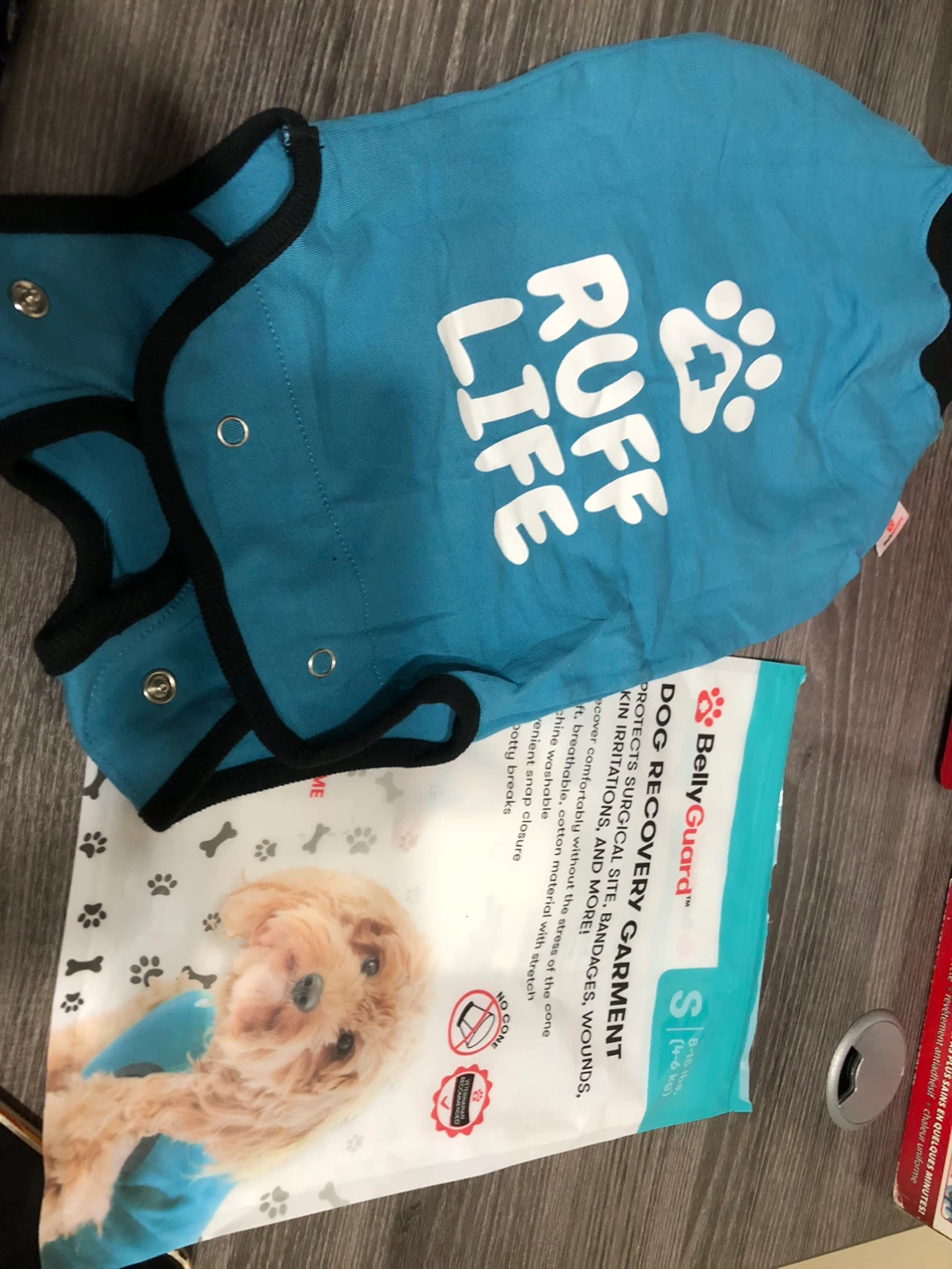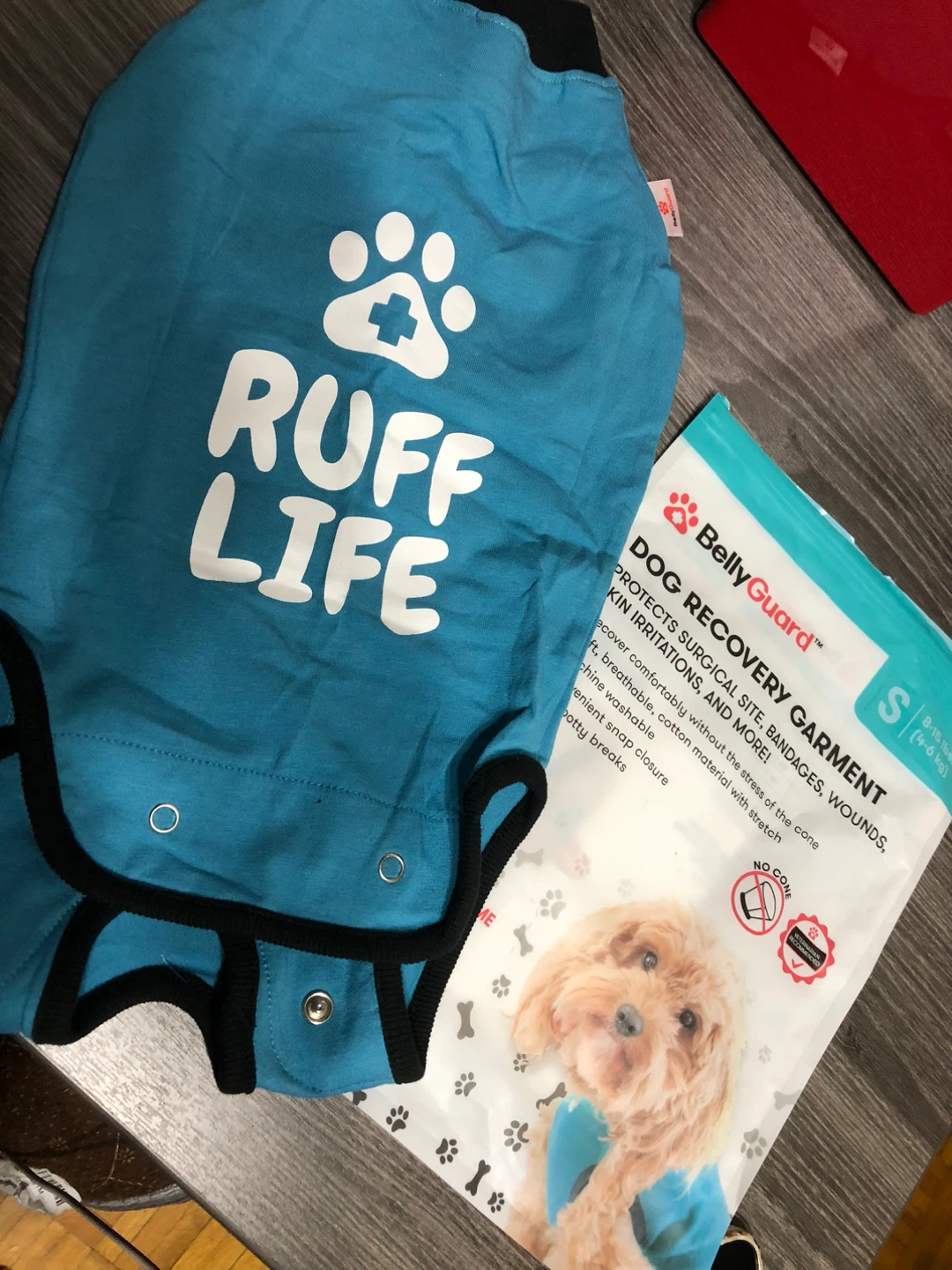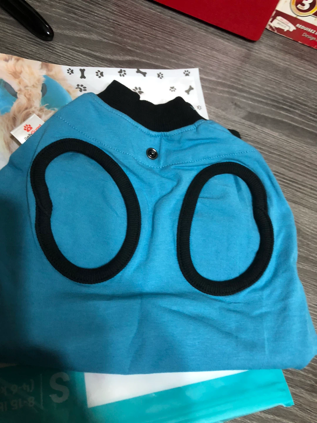 This is a BellyGuard dog recovery garment, designed to protect surgical sites, bandages, wounds and more! It's a size small, suitable for dogs weighing 8-15 lbs (4-6 kg). The garment is made from a comfortable cotton material with stretch and features a convenient snap closure. It's also machine washable!