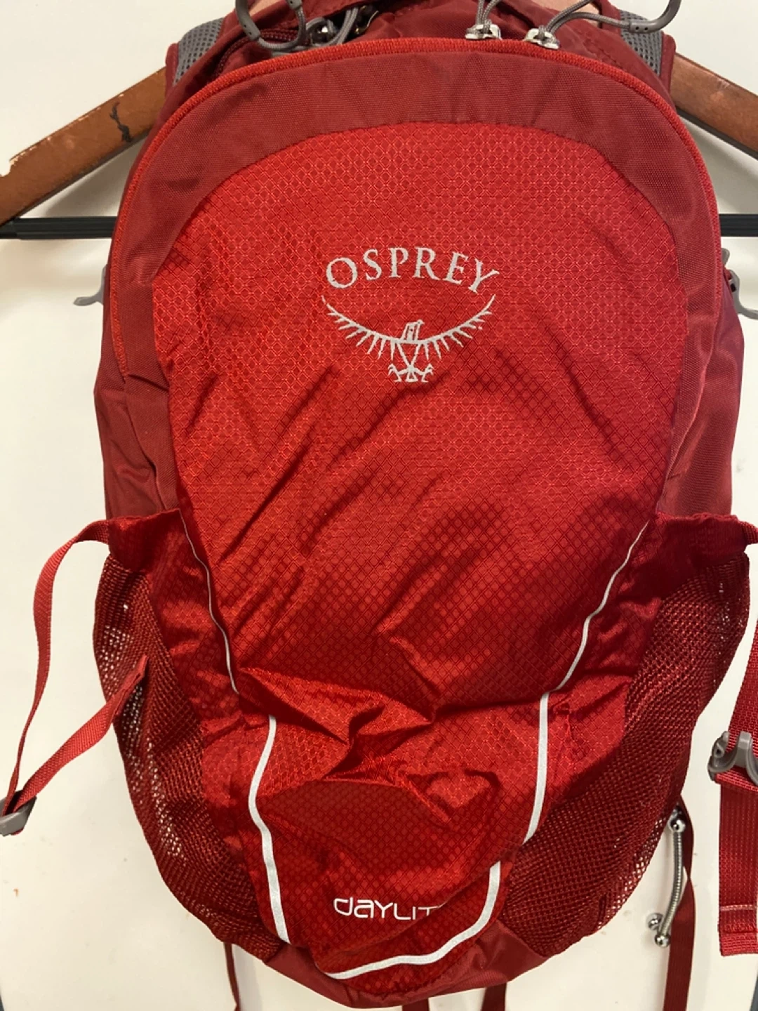 This is an Osprey Daylite backpack. It's a compact and lightweight pack, perfect for day trips. Features mesh side pockets for water bottles and adjustable straps.