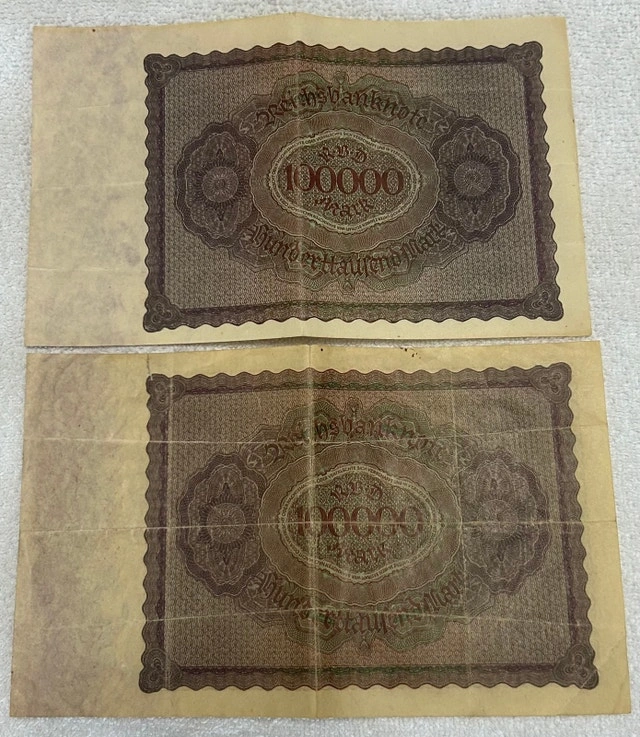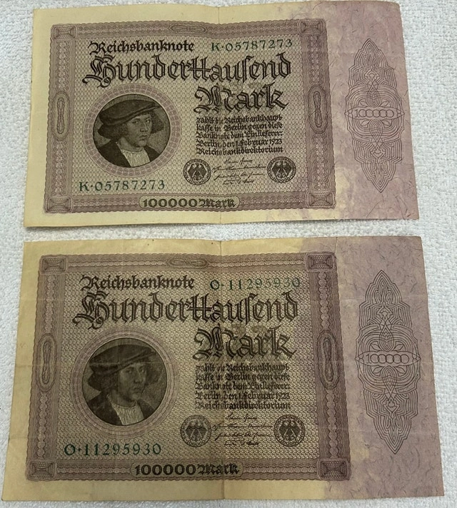 I'm offering two 1923, 100,000 German Mark notes. These banknotes are a collectible piece of Germany’s history. Cash accepted, Cashless payment. Curbside pick up available.