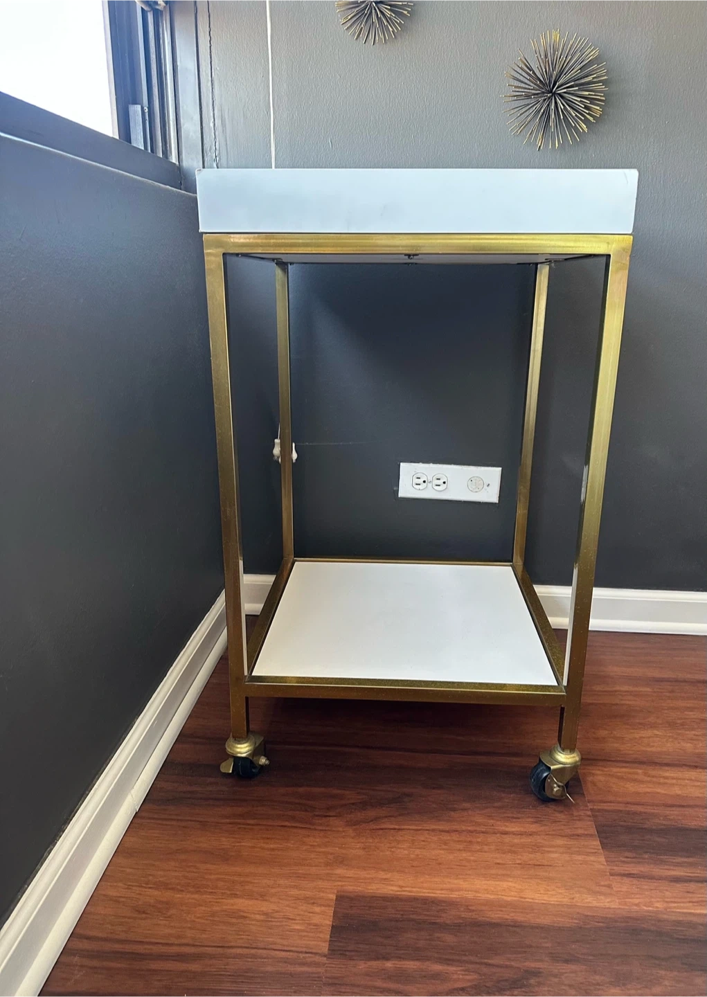 Purchased at Target, Threshold. Gold and white in color. Has a detachable tray at the top. Has slight normal wear on the tray. Measures 18” X 18” and 30 1/2” tall. It’s on wheels, portable.