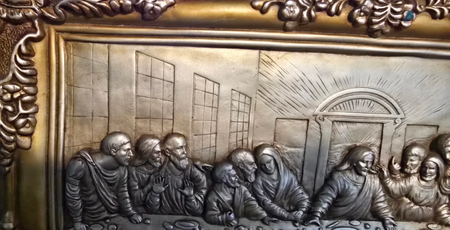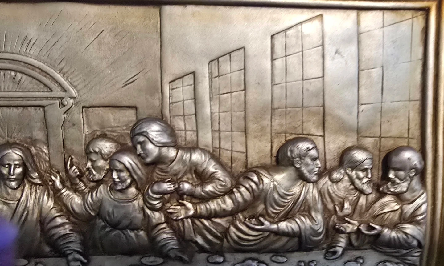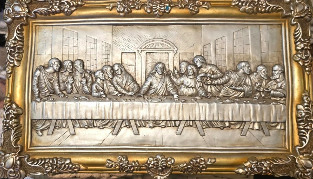 š„This is an antique vintage art piece depicting The Last Supper. Very detailed hand sculptured piece, made many decades ago, The artwork is very solid heavy piece gold with a silver finish.