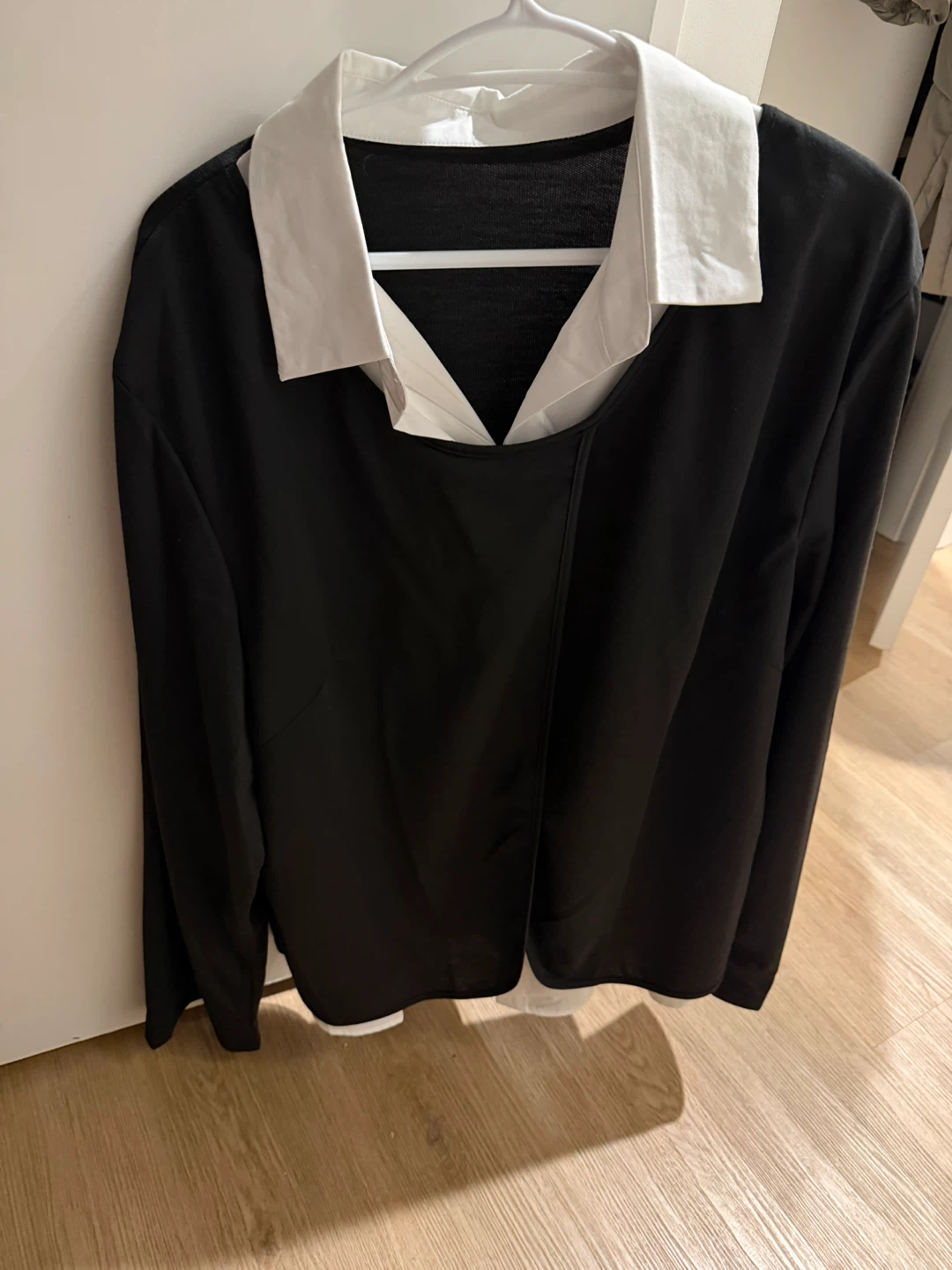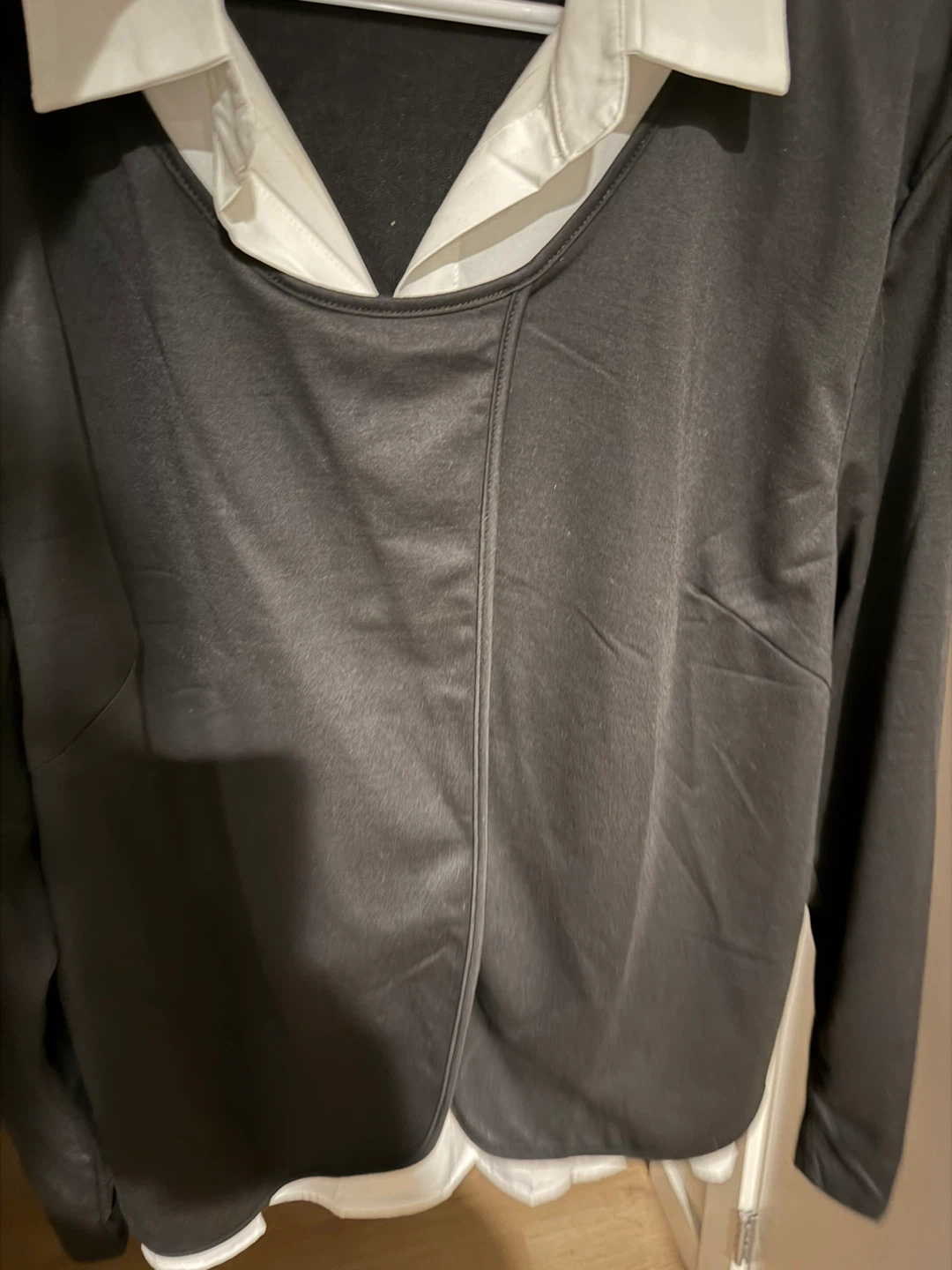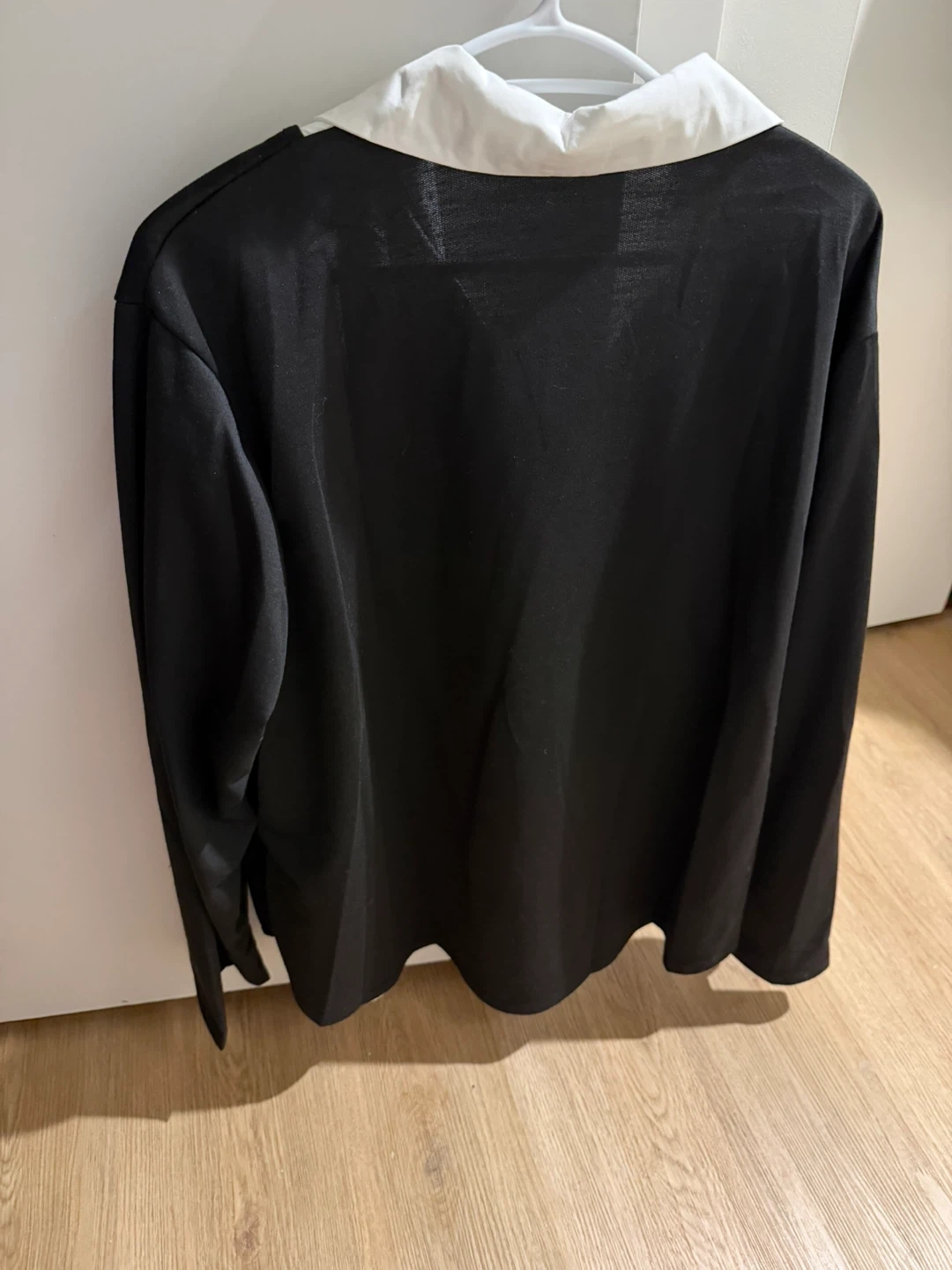 Black long sleeve shirt with a white collar. Made from 100% polyester. Size 3XL.