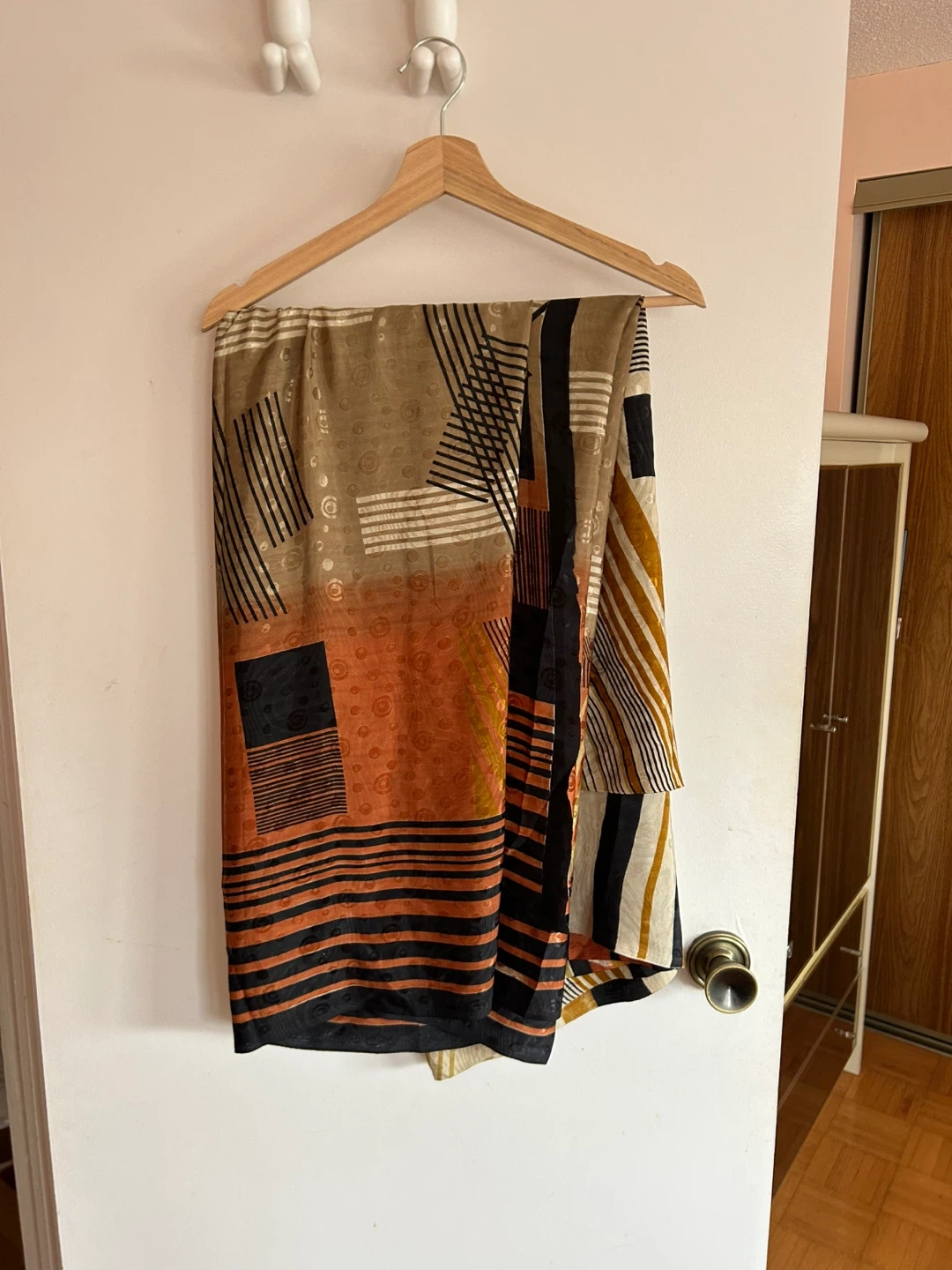 This fabric saree features a vibrant print with a mix of geometric shapes and floral motifs. It has a blend of warm earth tones with black and white accents. Material is soft and light and semi-opaque.